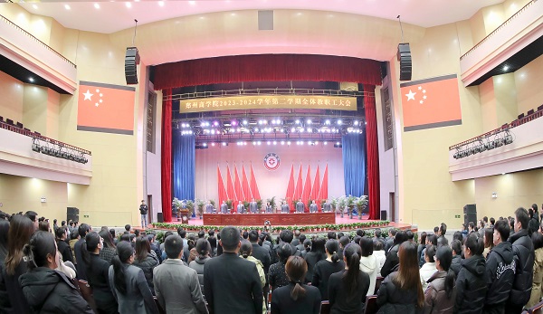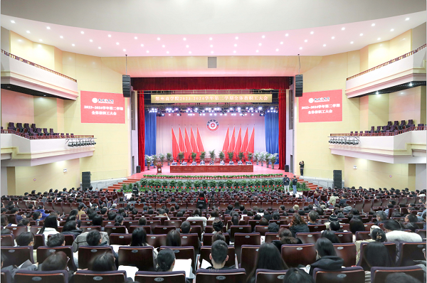 校长吴泽强作题为《笃行不怠守初心 砥砺廿载启新程》的校务工作报告。吴校长指出,本次会议的主要任务是:学习贯彻习近平总书记关于教育的重要论述,认真落实2024年全国全省教育工作会议精神,系统总结上学期工作成绩,安排部署本学期重点任务,统一思想、凝聚共识,笃行不怠、继往开来,切实以高质量发展的新成效,向建校20周年献礼。吴校长简要回顾了上学期的成绩和主要工作:一是教学工作成效显著;二是学生工作有声有色;三是审核评估稳步开展;四是招生就业工作走深走实;五是科研工作成绩斐然;六是办学品质不断提升;七是社会声誉和影响力进一步扩大。面对新形势,吴校长对标政策要求,结合学校实际,提出新学期学校发展的总体思路是:持续落实立德树人根本任务,贯通学年发展目标,锚定未完成的重点任务,以审核评估为主线,以全面提高人才培养质量为关键,以20周年校庆为契机,在深化改革、强化特色、提升内涵上拓展新空间、塑造新优势,加快推进学校高质量发展。吴校长安排部署了本学期的重点工作和专项工作。新学期要用心做好16项重点工作:强化学科专业内涵与特色建设;深入完善应然课程体系建设;做实研究生联合培养;拓展产教融合路径;提升特色育人成效;筑牢学生服务管理根基;提升招生工作质量;塑造就业工作品牌;稳步推进师资队伍建设;营造浓厚学术氛围;优化后勤服务保障;做好三彩校区二期工程规划与建设;强化对外交流合作;维护校园平安稳定;提升主管干部履职能力;强化督查考核。同时,全力做好2项专项工作:扎实推进审核评估;隆重庆祝建校20周年。为确保新学期各项工作落到实处,吴校长提出三点工作要求:一是锚定目标,以实干之行服务大局;二是珍惜平台,以虔诚之心展现作为;三是不惧挑战,以团结之力接续奋进。