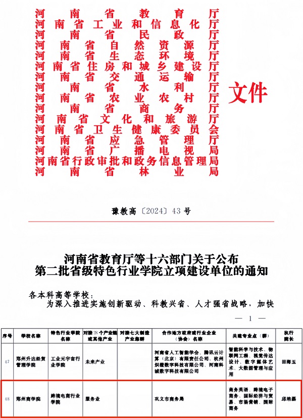 近日,河南省教育厅等十六部门联合下发《关于公布第二批省级特色行业学院立项建设单位的通知》(豫教高〔2024〕43号),beat365申报的“跨境电商行业学院”获批河南省第二批省级特色行业学院。