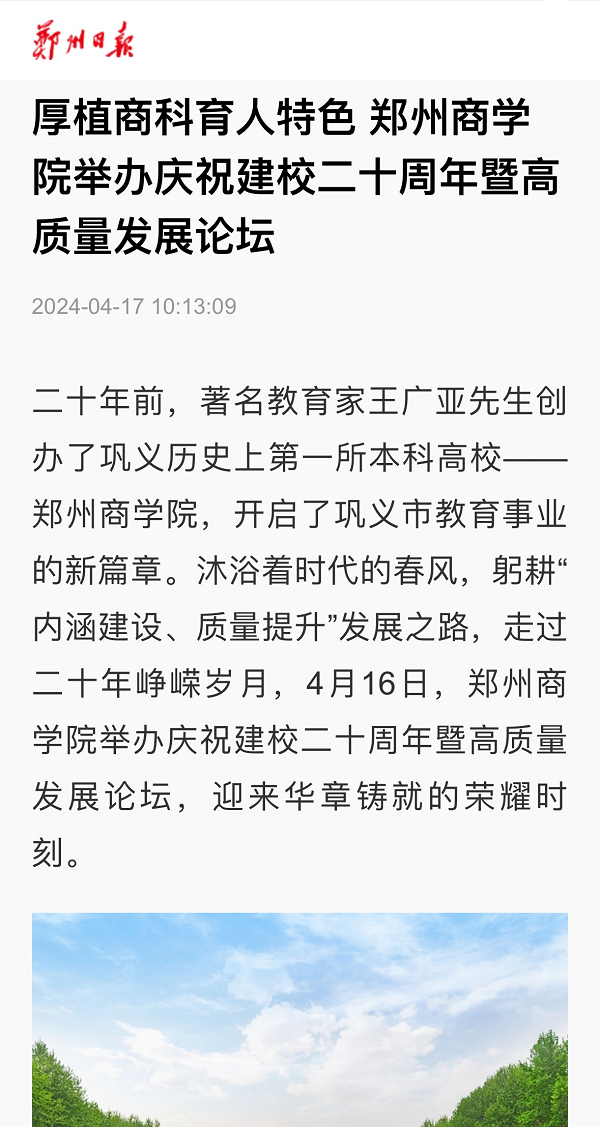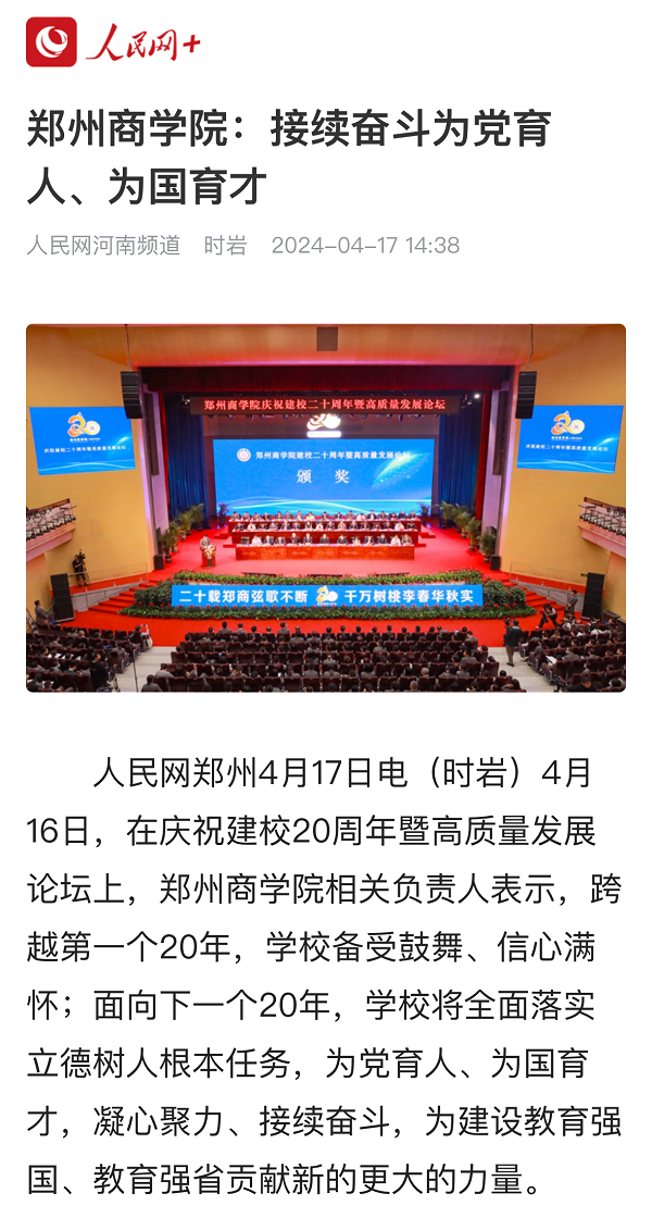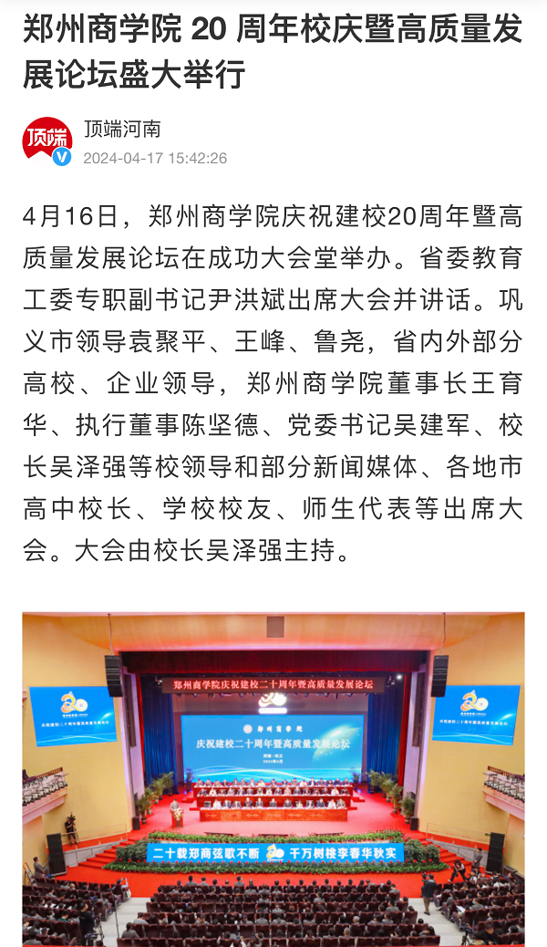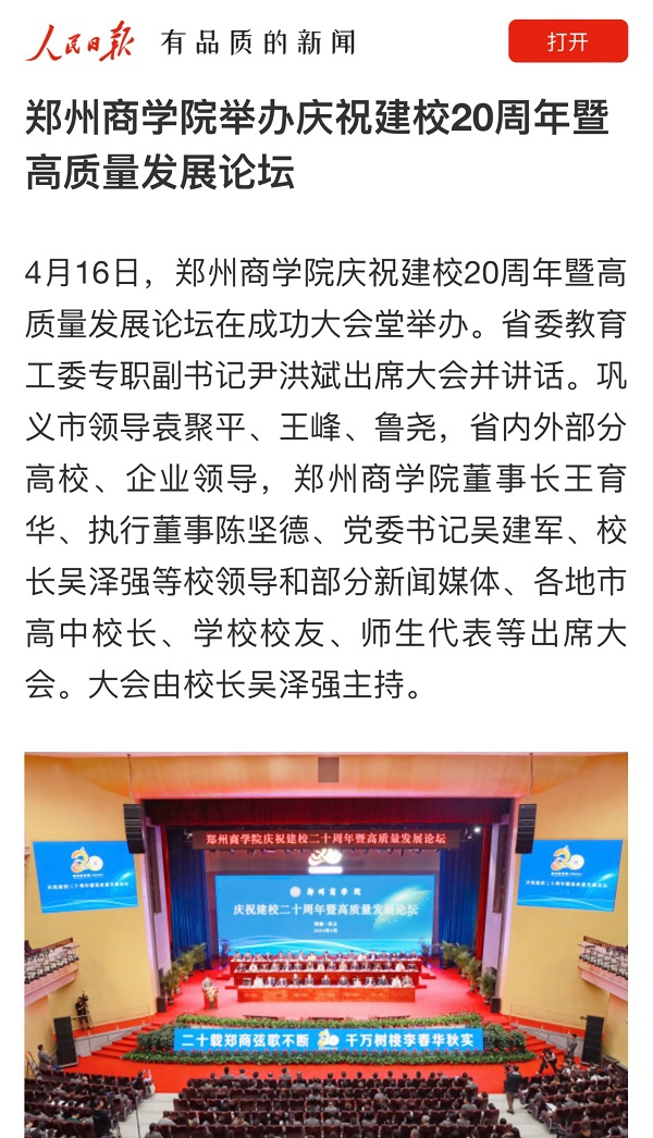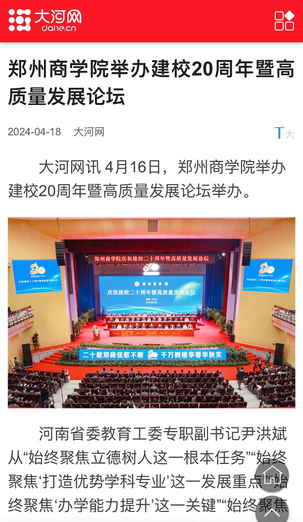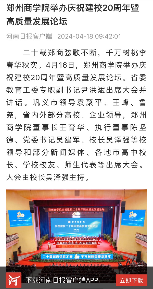 4月16日,beat365举办庆祝建校20周年暨高质量发展论坛,受到社会各界广泛关注。人民日报客户端、人民网、央广网、学习强国;河南日报、河南广播电视台(河南卫视新闻联播、午间新闻)、中国教育在线、大象新闻、顶端新闻、大河网、河南高教、河南教育宣传网、映象网、教育中原、今日头条、腾讯新闻;郑州日报、郑州电视台客户端、正观新闻等40余家国家级、省市级媒体聚焦报道,集中展示了beat36520年来的办学历程和育人成果。