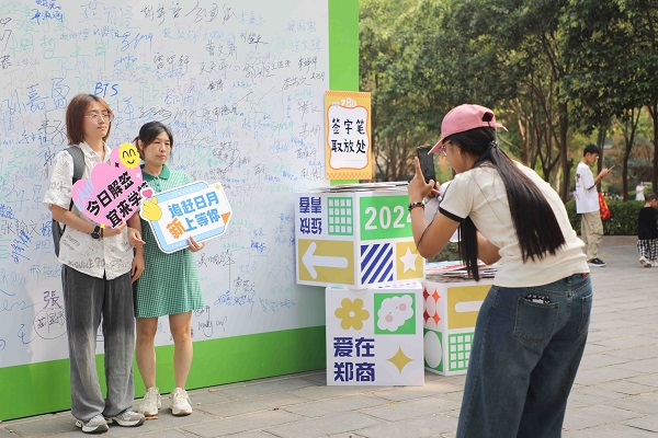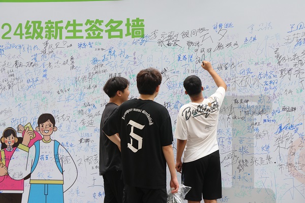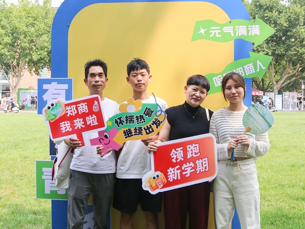 踏入郑商校园,“热烈欢迎2024级新同学”的巨大喷绘矗立在中心广场,“我是郑商人”“欢迎你,郑商‘新’上人”“你好,新同学”……各类宣传牌创意满分,块块展板、条条标语皆是喜气洋洋的迎新氛围。创意合影墙上,既有殷殷的关爱与嘱托,也有展望未来的期盼,不少新生和亲友拍照打卡,纪念成为郑商人的第一天。