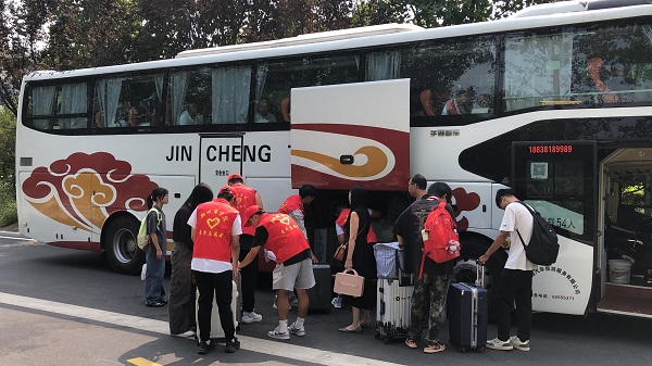 考虑到新生行李多、搬运难,学校在高铁站、火车站安排了接待站点,从早上7点到晚上7点,不间断派发迎新专线,为新生搭起“爱的护航”。