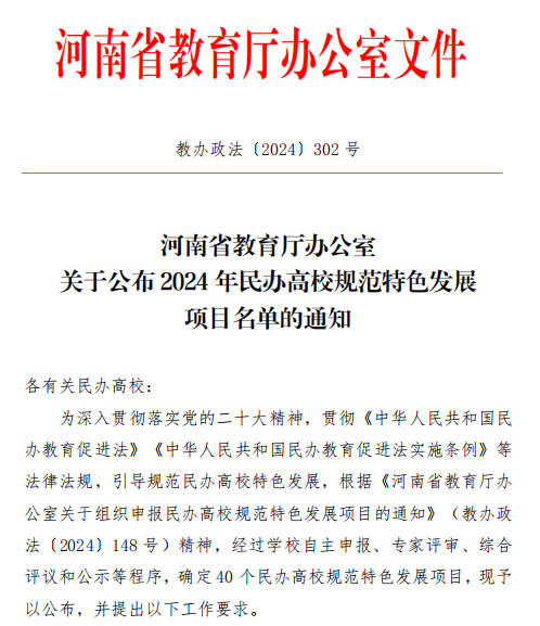 近日,河南省教育厅发布《关于公布2024年民办高校规范特色发展项目名单的通知》(教办政法〔2024〕302号),beat3652个项目获批立项河南省民办高校规范特色发展项目,分别为民办高校新商科硕士点培育建设、青少年学生法治宣传教育研究中心。