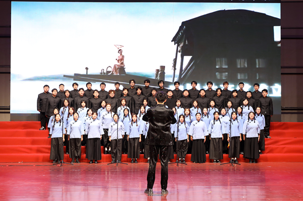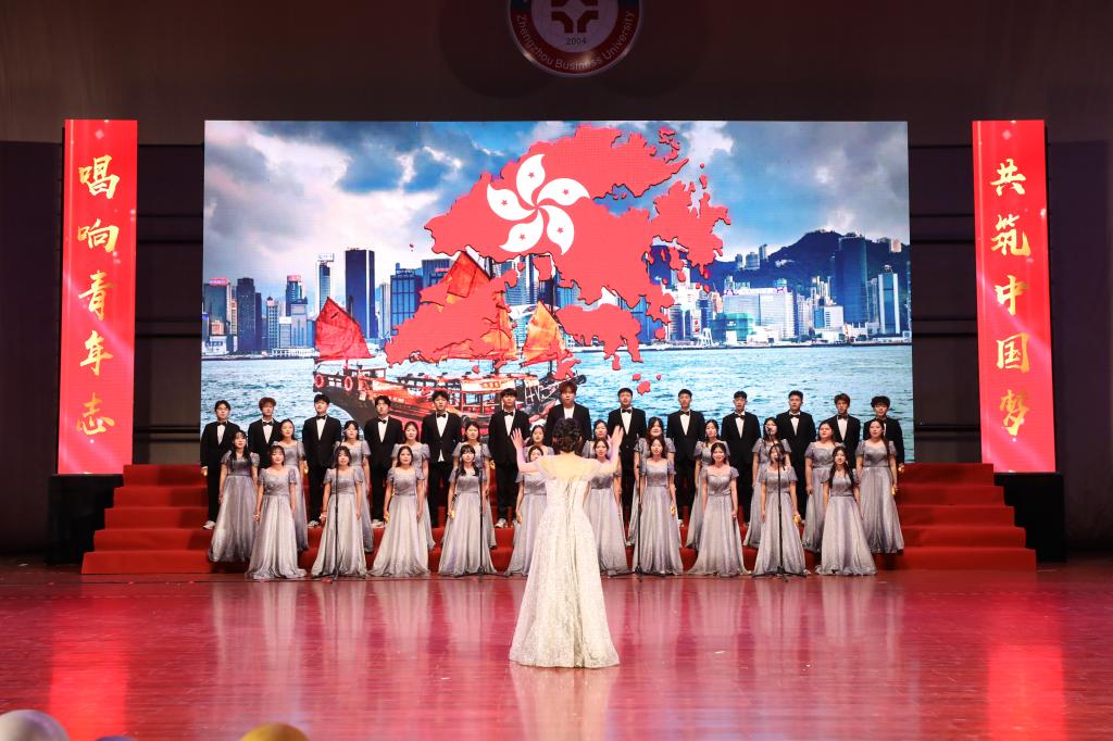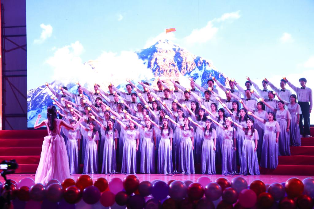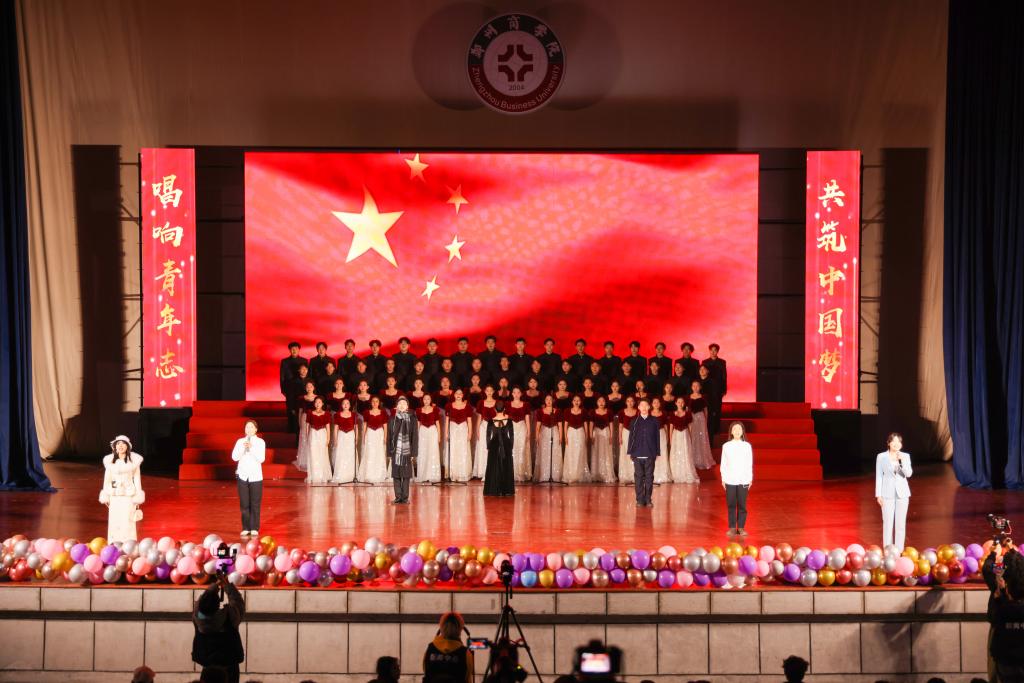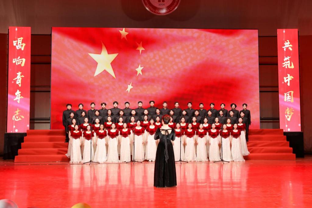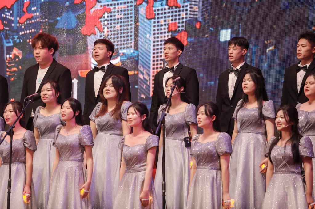 文传学院的《向往》以优美的旋律和诗意的歌词开启第三篇章“筑梦前行”,表达了青年学子对美好生活的向往和对未来的无限憧憬;管理学院的《走向复兴》则以宏大的叙事和坚定的信念,展现了中华民族从站起来、富起来到强起来的伟大飞跃;金贸学院的《追寻》将个人梦想与国家命运紧密相连,用歌声传递出对共产主义理想的坚定信仰和不懈追求。最后,校团委带来的《紫荆花盛开》以悠扬动人的旋律,展现了香港回归祖国后的繁荣景象和中华民族大家庭的团结与和谐。
