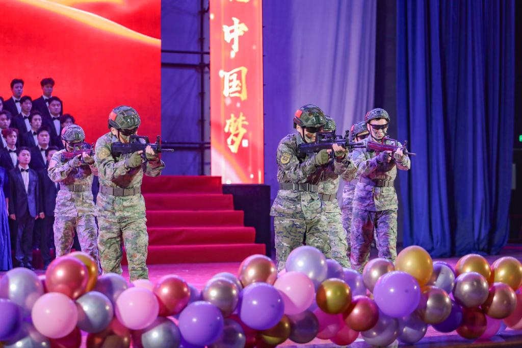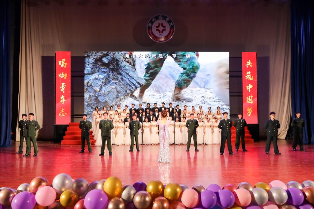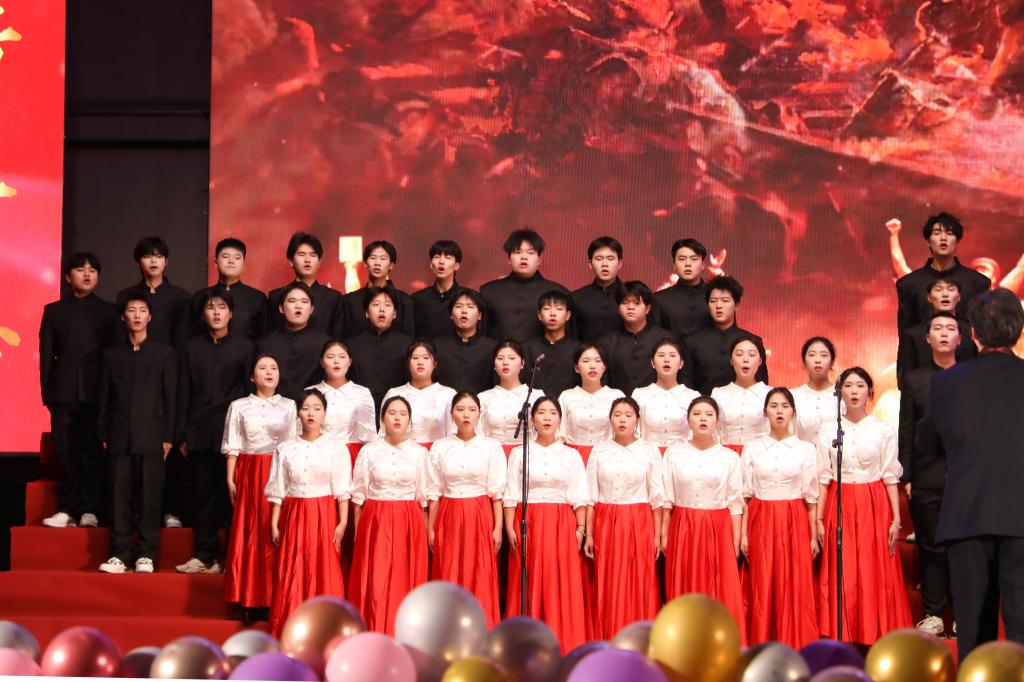 第一篇章“红色传承”由体育学院带来的《中国军魂》拉开序幕,雄壮的旋律瞬间点燃了现场气氛,同学们用歌声表达了对中国军人的崇高敬意和无限敬仰;外语学院的《我爱你中国》以其深情的歌词和真挚的情感,触动了在场每一个人的心弦,表达了对祖国深沉的爱恋;艺术学院则通过《山河已无恙》《强军有我》的组曲,回顾了国家从苦难走向辉煌的历程,展现了新时代青年投身国防事业的决心与勇气。