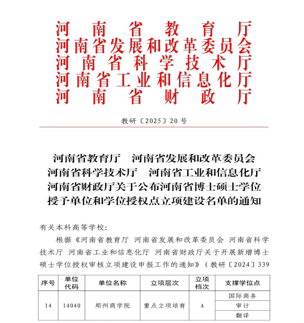 近日,河南省教育厅、河南省发展和改革委员会、河南省科学技术厅、河南省工业和信息化厅、河南省财政厅联合下发《关于公布河南省博士硕士学位授予单位和学位授权点立项建设名单的通知》(教研〔2025〕20号),beat365获批河南省硕士学位授予重点立项培育单位,国际商务、审计、翻译三个专业学位点获批硕士学位授予单位支撑学位点重点立项培育。这是beat365继2021年获批河南省硕士学位重点立项培育单位后再获此殊荣,本次立项不仅是对学校持续加强学科建设的高度认可,也为学校未来高质量发展注入新动力。