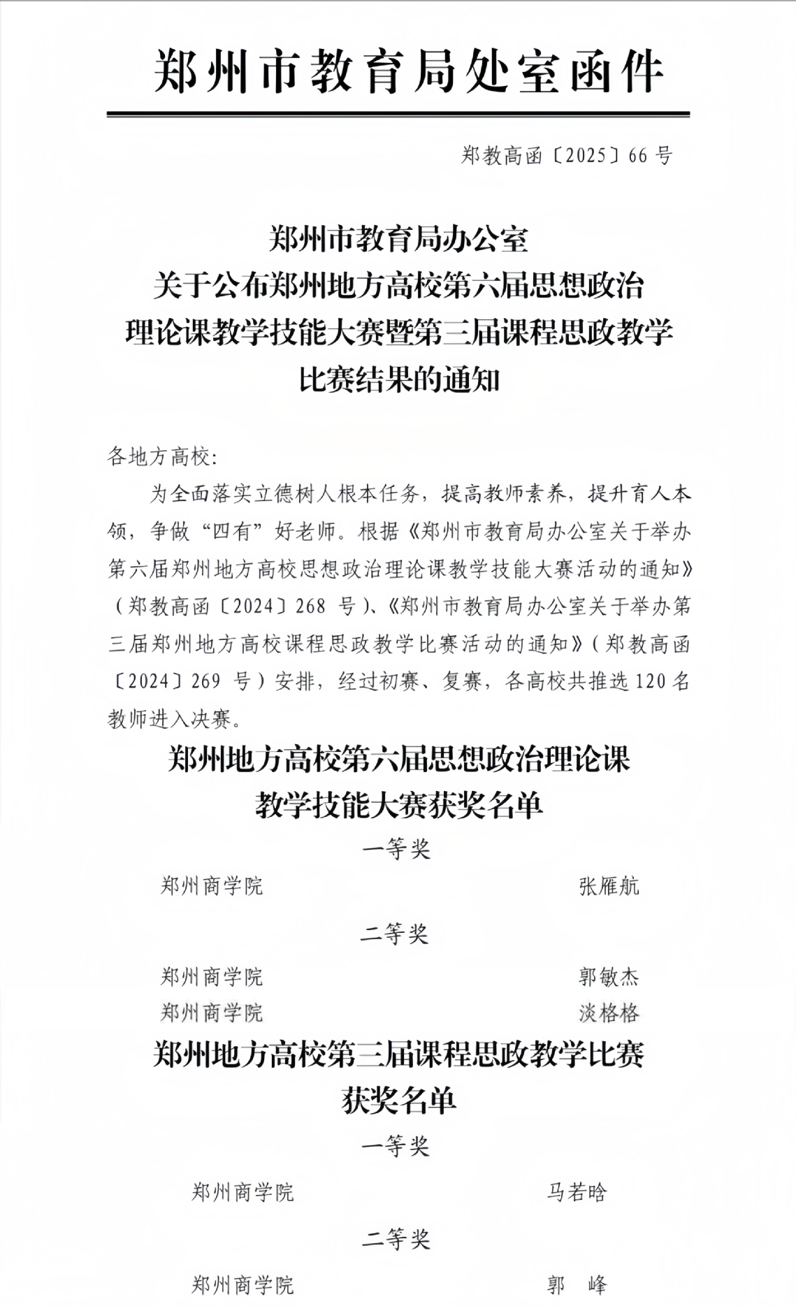 近日,郑州市教育局发布《关于公布郑州地方高校第六届思想政治理论课教学技能大赛暨第三届课程思政教学比赛结果的通知》(郑教高函〔2025〕66 号),beat365张雁航老师获第六届思想政治理论课教学技能大赛一等奖,郭敏杰、淡格格老师获二等奖;马若晗老师获第三届课程思政教学比赛一等奖,郭峰老师获二等奖。