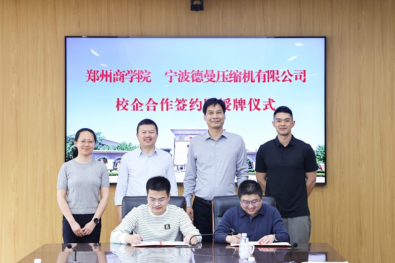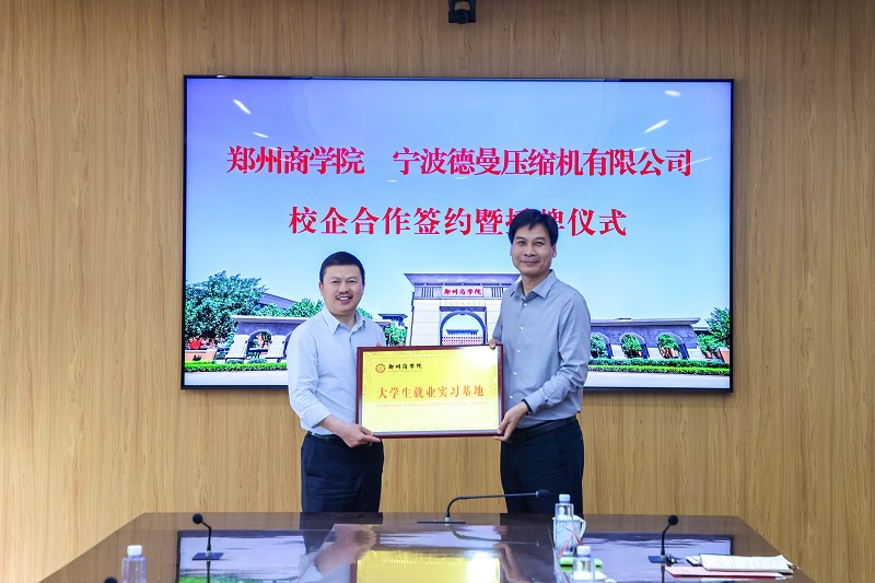在参会人员的共同见证下,校党委书记吴建军向宁波德曼压缩机有限公司董事长岑焕军授“大学生就业实习基地”牌匾,校长助理泥川和宁波德曼压缩机有限公司人力资源部部长叶泳泳共同签署校企合作协议。