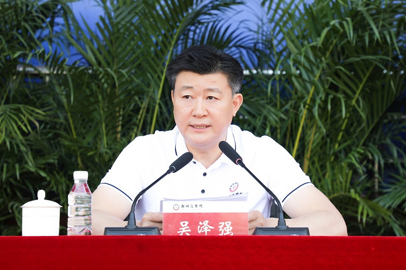 校长吴泽强致开幕辞。他首先对运动会的开幕表示热烈祝贺,向为筹备此次运动会付出辛勤努力的全体师生致以诚挚的问候,对积极备战的运动员们寄予美好祝愿。吴校长回顾了学校在体育事业上的发展历程,郑商在体育设施建设、大学体育改革方面持续加大投入,为同学们的成长成才提供了优越的健身运动环境,“无运动、不郑商”已成为郑商人的普遍共识。吴校长对大家提出四点希望,一是大力发扬奥林匹克精神,展现郑商人的风采与担当,二是全体裁判员和志愿者要以高度的责任感和使命感,认真负责、恪尽职守,三是各参赛单位要相互学习、加强交流、增进友谊,四是全校师生上下一心、精诚团结,共同把本届运动会办成一场安全有序、团结紧张、严肃活泼的综合体育盛会。以运动之火点亮生命之光,以强健之姿共筑教育华章,为学校的发展注入新的活力与动力。