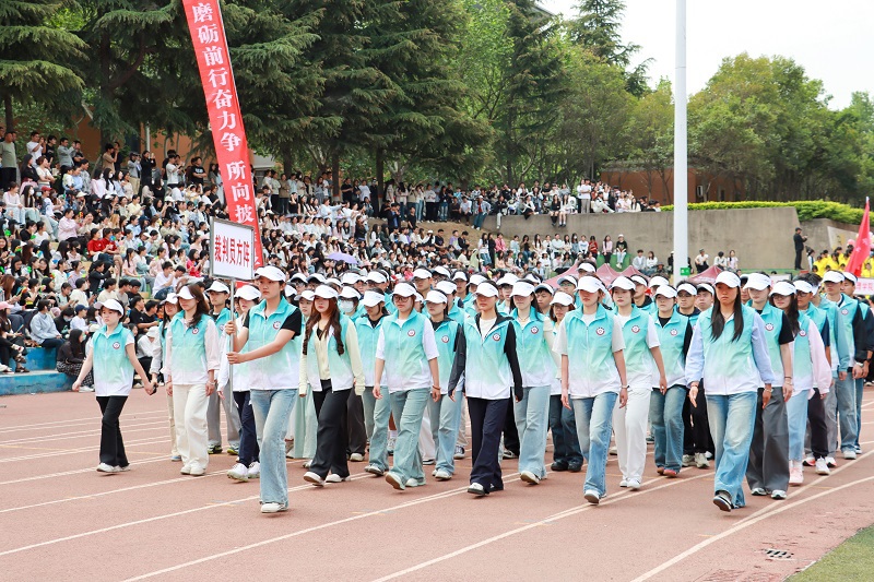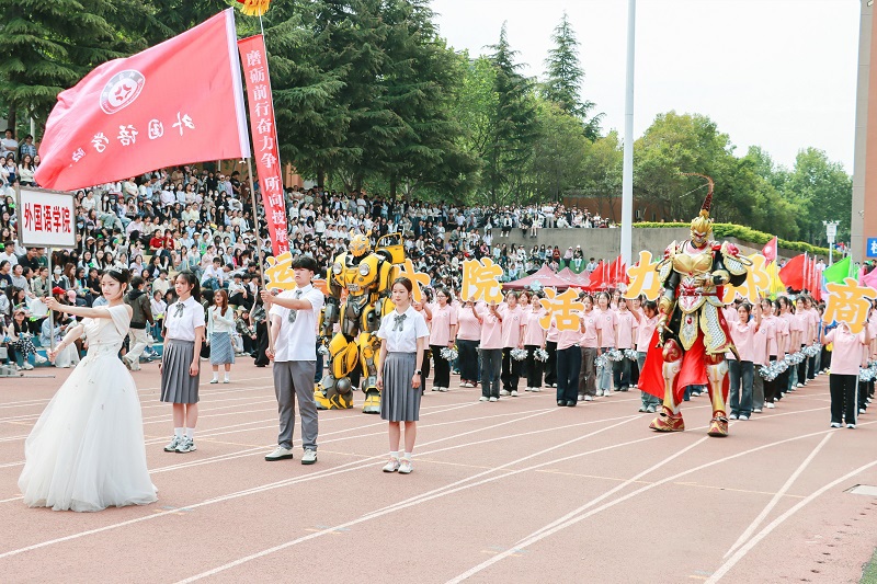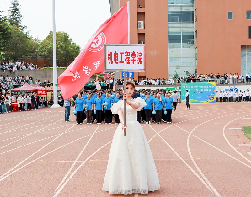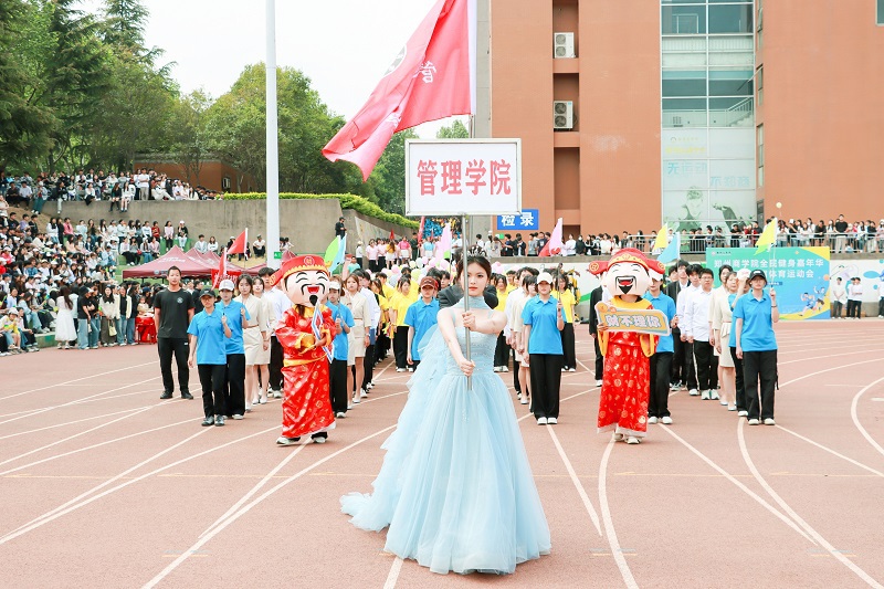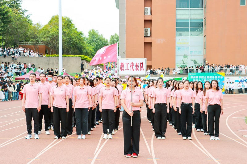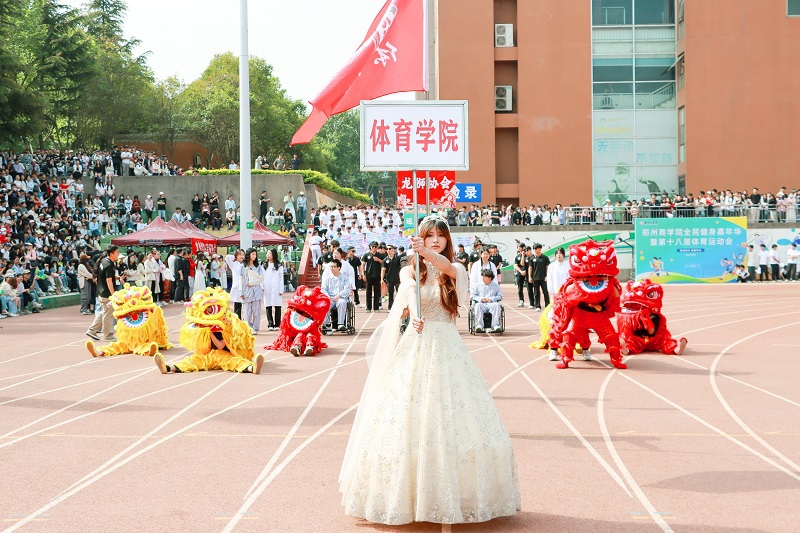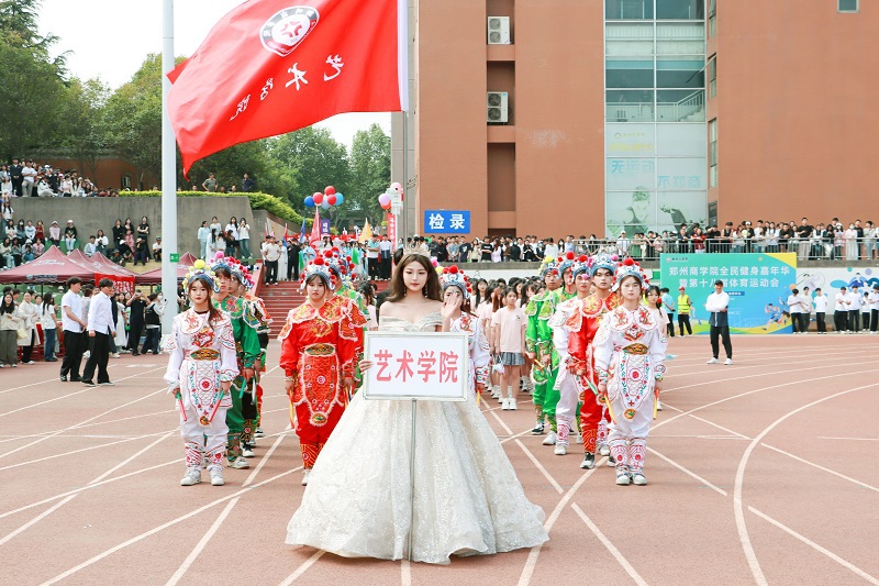在活泼有力的《运动员进行曲》旋律中,裁判员方阵、教职工代表队、各学院学生代表队依次闪亮登场。裁判员们身着统一制服,步伐稳健,神情专注,他们将以专业素养为尺,以严谨态度为秤,全程坚守、一丝不苟;教职工代表队精神饱满,笑容满面,展现出郑商教师昂扬向上的精神风貌。各学院学生代表队创意无限、精彩纷呈,精心设计了独特的入场形式。管理学院的同学们身着各式的工作服装,目光坚定向前,每一步都踏响着团结的节拍;会计学院的同学们迎着朝阳的光辉,踏着时代的鼓点,昂首阔步;金贸学院特色表演方阵身着蓝橘队服,手持各色太阳花,在阳光下熠熠生辉;“讲好外国语,做好中国人”的口号声响彻云霄,外语学院代表队以自信昂扬的步伐,踏出青春最美的节拍;机电工程学院的同学们身着湛蓝与银灰交织的统一队服,恰似电路板上跃动的电流与精密器械的金属光泽;大数据工程学院用AI造型表演展示学科专业自信,用精细线条连贯天地,以代码逻辑突破极限;鼓声雷雷,雄狮欢舞,艺术学院的同学们眼神自信而坚毅,热忱如火炬,朝气蓬勃、青春洋溢,昂首向前;文传学院同学们以青年风骨为底色,踏着时代的鼓点,在运动场上铺展出一幅流动的百年画卷;智能建造学院的队伍在吉祥物“健健”和“乐乐”的带领下,手持“兴海桥”模型,以专业之力,为时代铺就通向未来的坚实道路;体育学院龙狮协会、健身协会、运动康复协会、田径协会、研究生方阵扬着自信的脸庞,迈着矫健的步伐,依次展现风采。各学院独具匠心的创意设计与别出机杼的精彩呈现,折射出郑商学子天马行空的奇思妙想,展现出全体师生蓬勃昂扬的青春姿态与锐意进取的精神品格。这份创新与活力交织的独特魅力,彰显着师生们敢为人先的朝气与自信向阳的风采。现场欢呼声、掌声此起彼伏。
