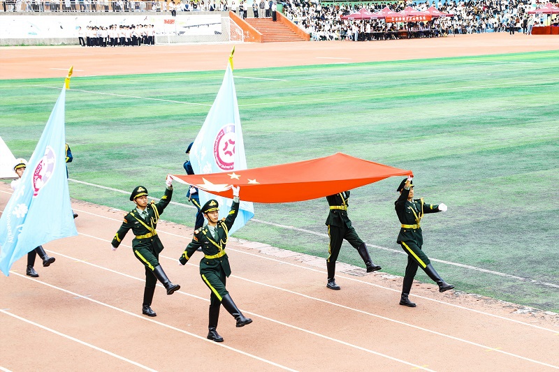 开幕式入场仪式上,国旗护卫队英姿飒爽,迈着整齐有力、气宇轩昂的步伐,护卫着鲜艳的国旗、校旗和象征着团结拼搏、积极向上精神的会徽率先入场。他们坚定的眼神、挺拔的身姿,展现出对国家和学校的深深敬意,也让现场氛围瞬间庄重而热烈。