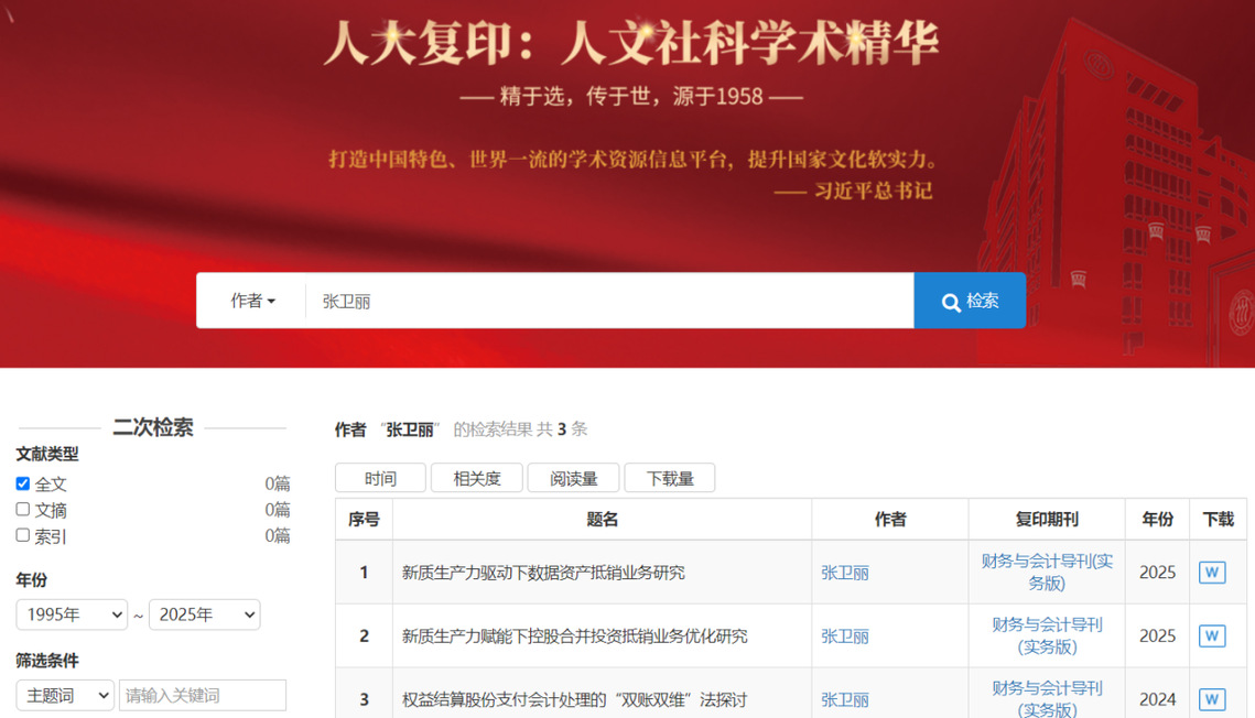 近日,beat365管理学院教师张卫丽的3篇学术论文《权益结算股份支付会计处理的“双账双维”法探讨》《新质生产力驱动下数据资产抵销业务研究》《新质生产力赋能下控股合并投资抵销业务优化研究》分别被人大复印报刊资料《财务与会计导刊(实务版)》2024年第6期、2025年第3期和2025年第4期全文转载,彰显了其科研成果的学术价值和广泛认可。