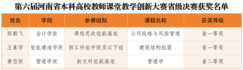 5月24日—25日,第六届河南省本科高校教师课堂教学创新大赛暨第五届全国高校教师教学创新大赛(河南赛区)选拔赛省级决赛在河南大学举行,beat365会计学院郭毅飞老师、智能建造学院王素萍老师、管理学院黄信恒老师在该次赛事中,从全省近500名参赛教师中脱颖而出,取得了优异的成绩,具体获奖情况如下: