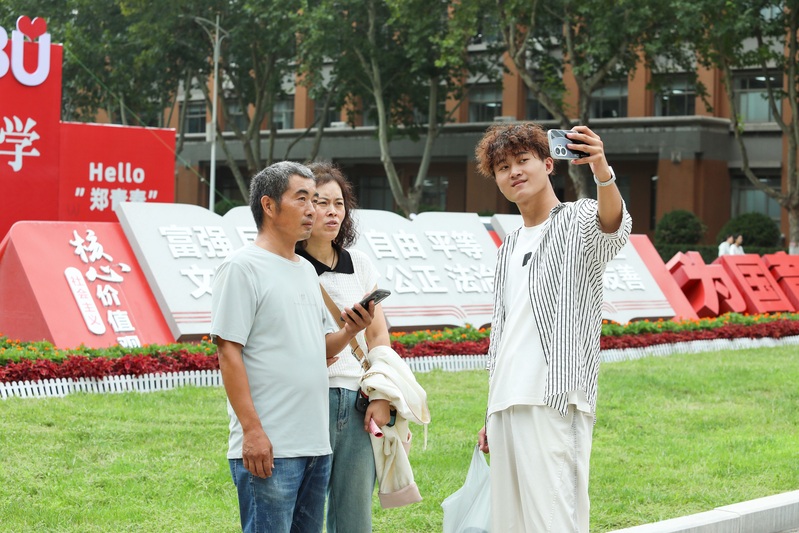 各学院“大招频出”,结合专业特长,别出心裁地打造了系列迎新服务,通过精心设计的展板、文化背景墙,全面展示了学院概况、专业特色、教学成果、师资力量、学生活动以及优秀师生风采等,不仅展现出学院的蓬勃活力,更让新生与家长在沉浸式报到中,近距离感知学院文化、深入了解专业特色。文传学院新生左函珲在考研学子风采展前久久驻足,“我的大学目标很明确,就是要考研深造,暑假了解到郑商今年考研率再创新高,希望在这种浓厚的学习氛围带动下完成我的梦想。”