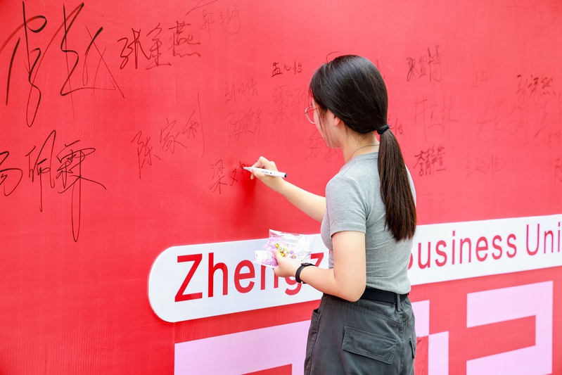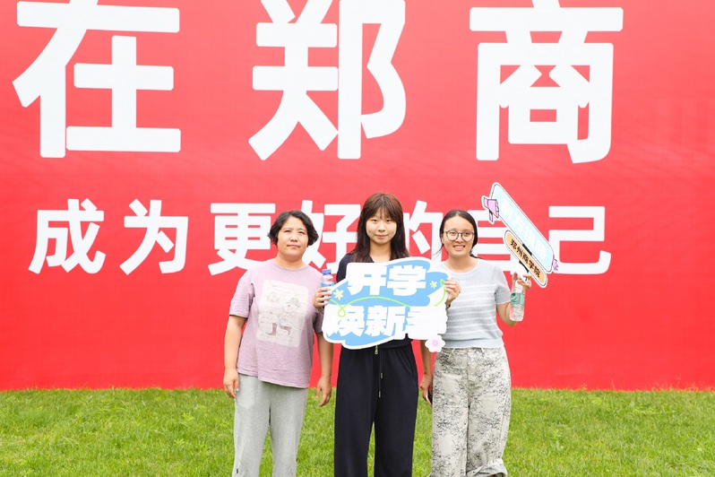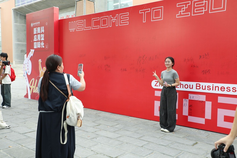 学校中心广场上,“热烈欢迎2025级新同学”“郑商人”“郑青春”的巨型喷绘格外醒目;“在郑商成为更好的自己”“爱在郑商”“我是郑商人”等温馨标语,满是巧思与热情;创意合影墙新颖有趣,不少新生与家人挚友驻足打卡,“咔咔咔”的快门声成了迎新日最轻快的背景音乐。来自安阳的新生张靖然与家人一起,在迎新背景墙前笑容灿烂地定格下成为“郑商人”的珍贵瞬间。“学校的迎新氛围太棒了,这张照片为我们全家留下了特别有意义的纪念。”她开心地说。精美的签名打卡墙是迎新日的“人气地标”,人流络绎不绝,它是新生与郑商初次相遇的满满仪式感,同学们手握特制的签名笔,在墙面上庄重地写下自己的名字,每一个名字,都是青春画卷上独一无二的落款,宣告着“我,已正式成为郑商人!”