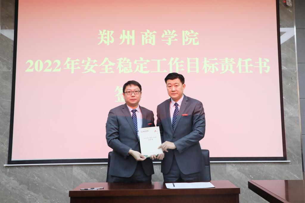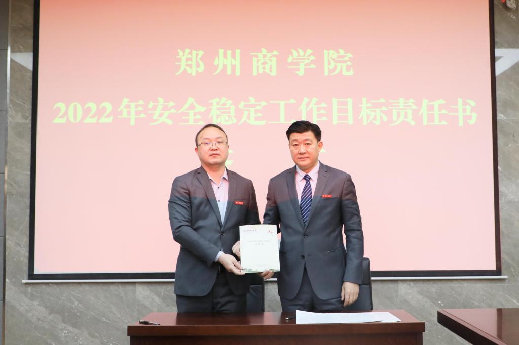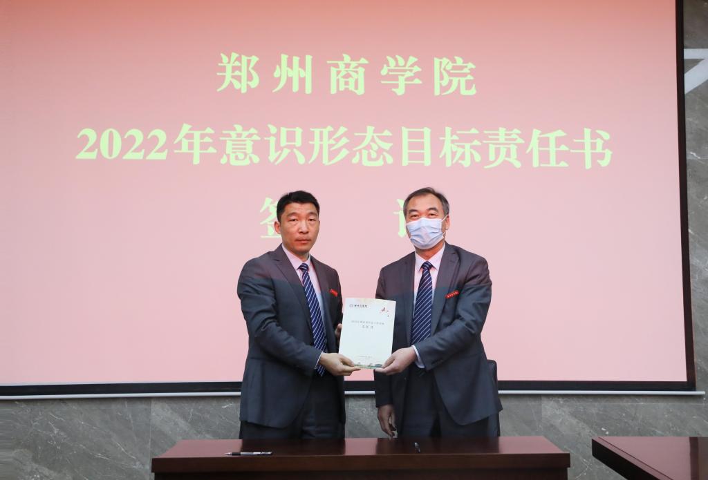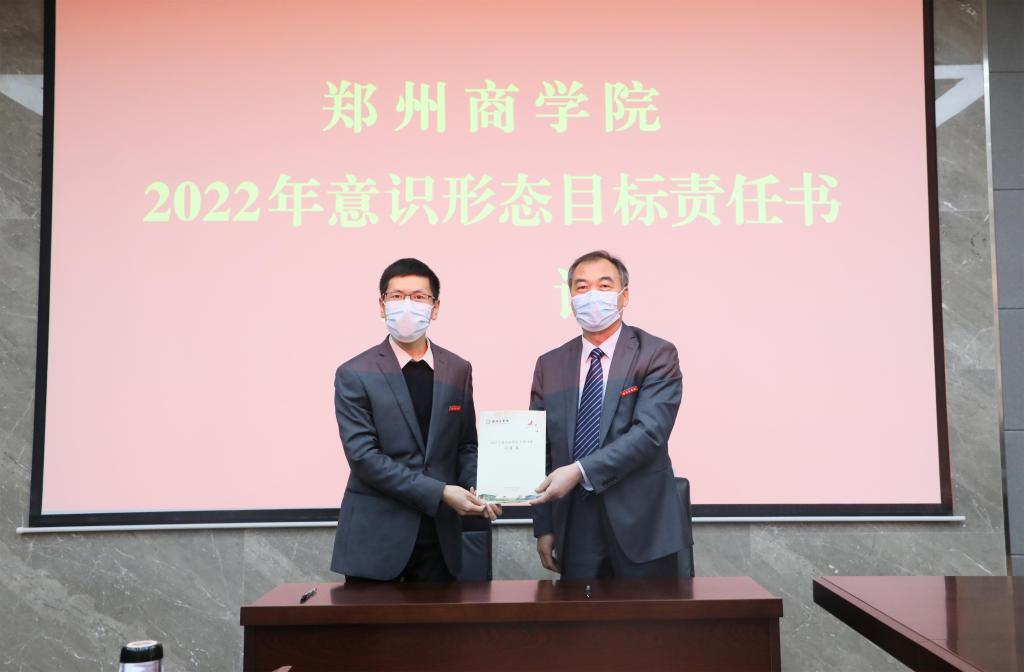全体校领导、党委委员、各部门主管参加了会议。会议现场,党委书记马书臣、校长吴泽强分别同各部门主管签订了《2022年意识形态目标责任书》和《2022年安全稳定工作目标责任书》。