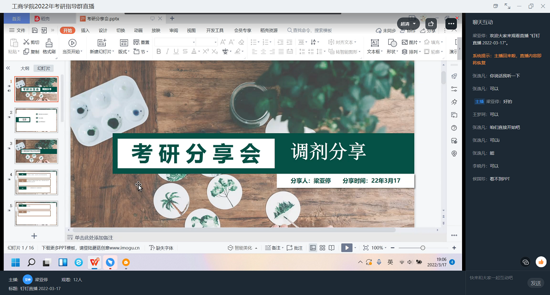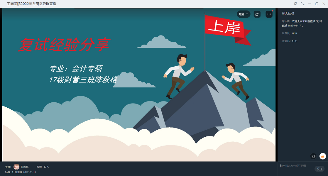 为持续推进我院2022届毕业生考研复试工作,更好地落实 “稳就业、保就业”的全面部署,全力促进毕业生更加充分更高质量就业,3月17日晚,我院组织开展线上考研指导主题报告会——学长学姐说考研。我院2022届毕业生及优秀考研校友陈秋格、代英杰、梁亚停参加会议。