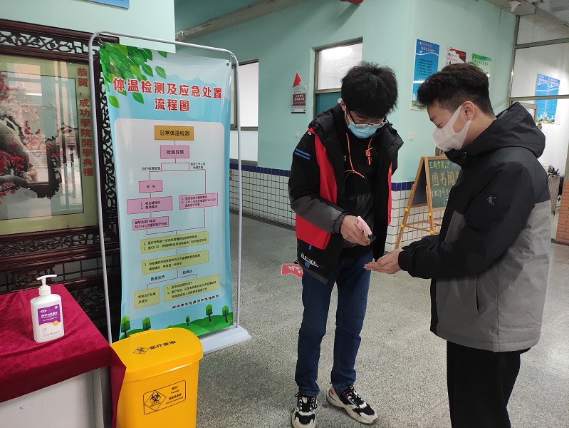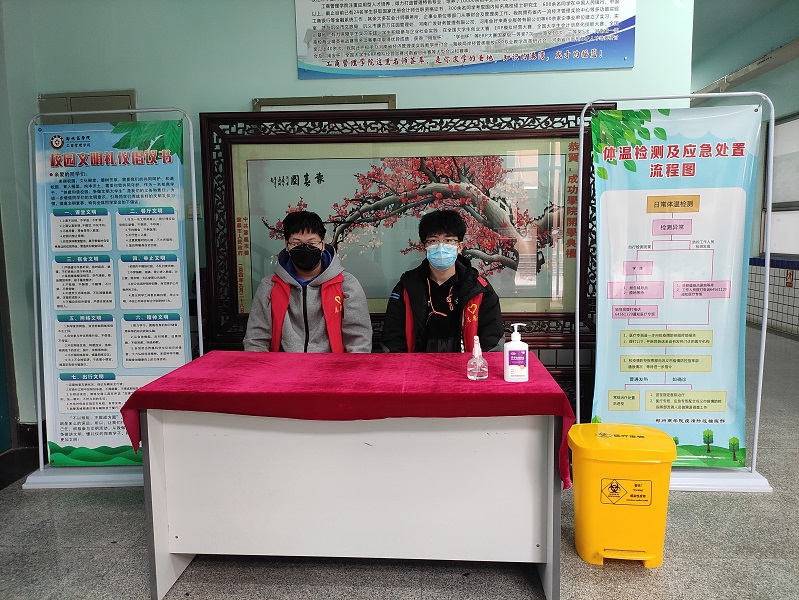 加强管理,科学防控。为进一步加强疫情防控工作,有效阻断疫病传播途径,我院在2号教学楼设置体温检测台,对出入教学楼的同学进行消杀和体温检测,严格落实了校园消杀常态化制度,为师生安全保驾护航。严格落实“日报告”“零报告”制度和出入校园制度,监督同学们认真完成测温、按时健康打卡、认真对待晨午晚检,全面加强对师生的健康监测,严格遵守学校的各项疫情防控制度,不麻痹、不放松。
