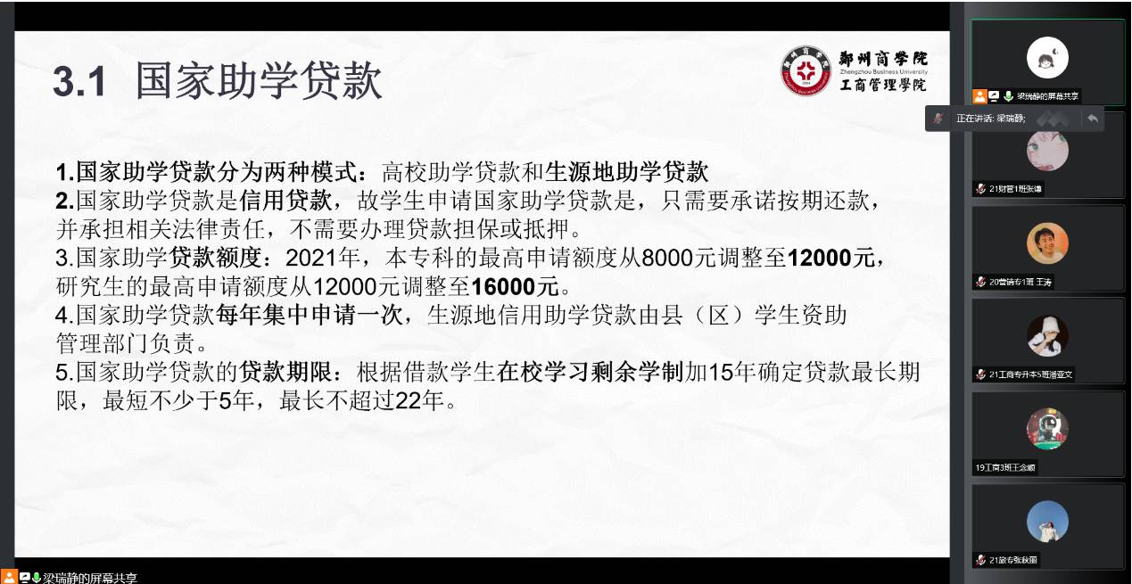 在培训正式开始之前,主讲老师抛出5个问题,引导各班资委带着问题来进行听讲。此次培训主要从以下三个方面开展,首先主讲老师从日常工作出发对资助委员的职责进行解读,并肯定了资助委员对于班级稳定的重要意义;其次主讲老师从国家层面对资助工作的意义进行介绍,增强资助委员的责任感和荣誉感,并强调资助工作的公平公正公开;最后也是本次培训的重点,主讲老师从意义、利息以及贷款流程等方面对国家助学金进行讲解以便资助委员后期对同学们的疑问进行解答,同时通过对去年资助工作进行梳理,进一步强化资助委员的工作能力。