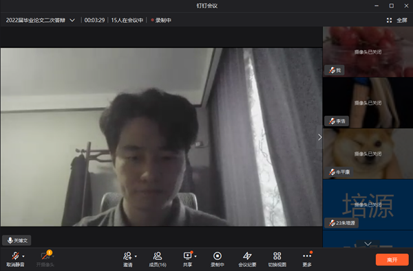 为保证我院2022届本科毕业生的毕业论文质量,使学生能更深刻、透彻地理解所选课题的内容,我院于4月29日下午,在线上通过钉钉会议的形式,为3名未能达到参加一辩条件的同学以及8名一辩未通过的同学组织了第二次答辩。本次答辩共有1个答辩组,该答辩组由3名论文指导教师和1名答辩秘书组成,负责这11名学生的二辩工作。