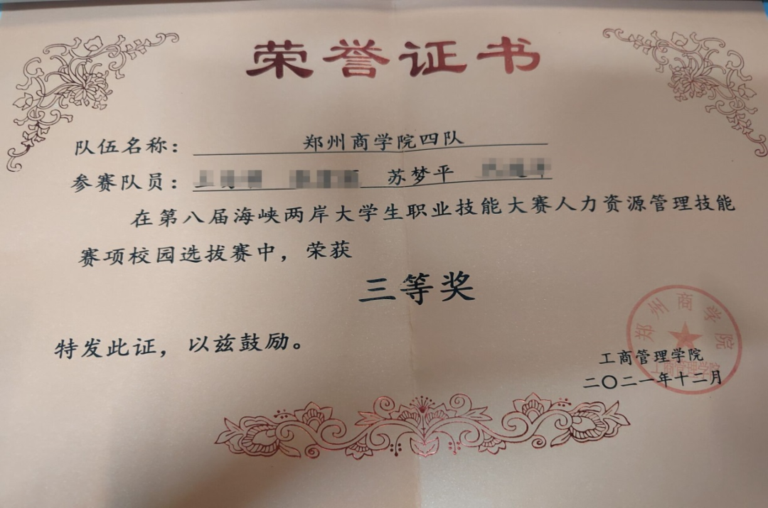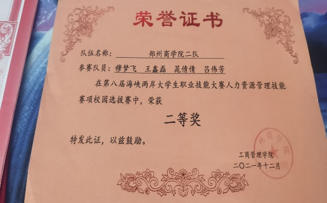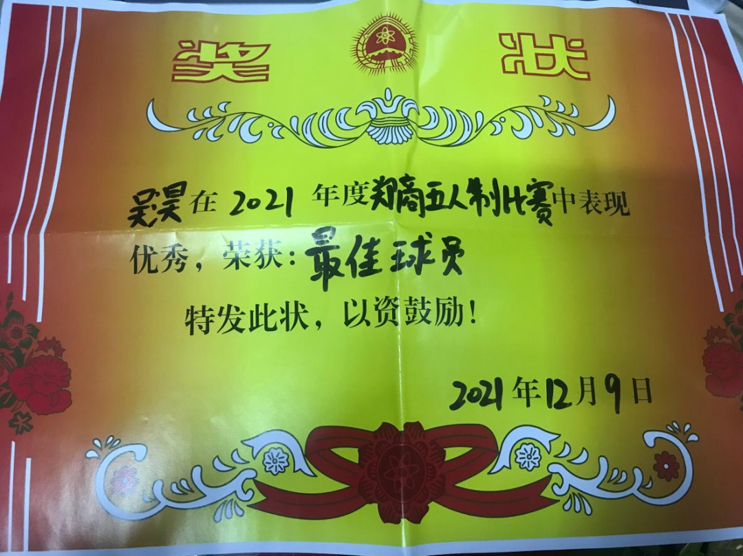 吴淏同学积极参加学校组织的足球联赛,代表工商管理学院参加比赛,在2021年度郑商五人制比赛中表现出色,与其他球队成员顽强拼搏、挥洒汗水、积极配合,获得最佳球员称号。以此她更加坚定了对体育运动的热爱。