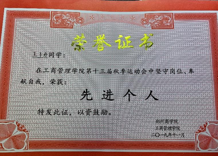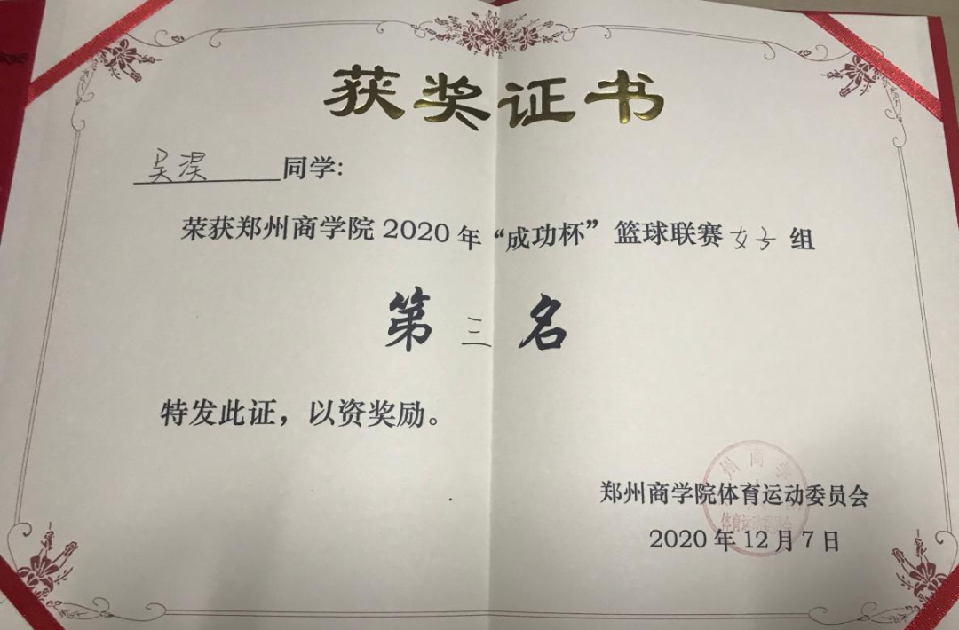 吴淏同学积极主动参加学校组织的各项体育联赛和校园运动会,体育竞赛的精神不仅仅在课本上,更在实践中。作为工商管理学院的学生,她积极参加beat365唯一官网2020年“成功杯”篮球联赛,加入工商管理学院女子篮球队,代表学院参加比赛,并在比赛中获得女子组团体第三名的好成绩。借助学校提供的竞赛平台,认识了各个学院的同学,增进了学院间友谊,开阔了视野。在公平、激烈、精彩的竞争中提高了身体素质,并且领悟了团队协作的精神和力量。