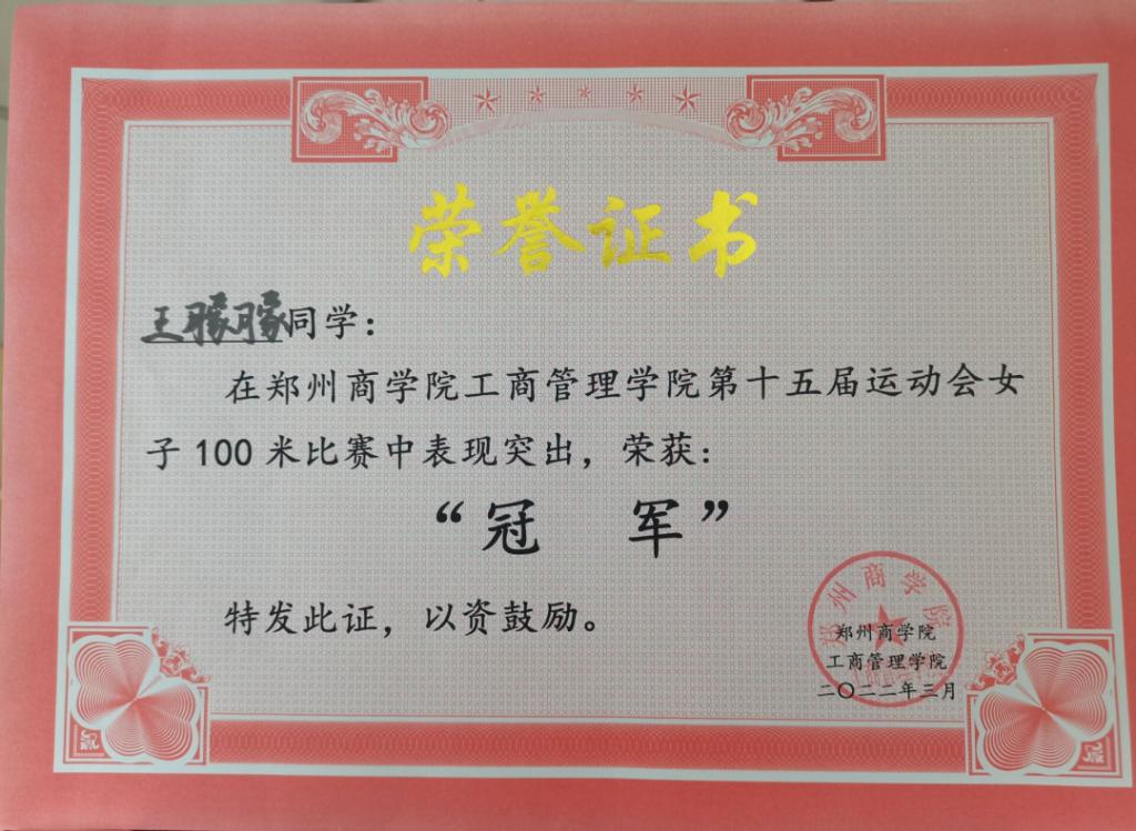“无运动,不郑商”的理念已渐渐植入每一个郑商人心中,为响应学校“身体素养提升工程”,王朦朦同学积极地参加了工商学院举行的第十五届运动会。在运动会中,女子100米预赛被安排在上午举行,王朦朦同学以16.59秒的成绩成功入选决赛。此时她的成绩也只是勉强挤进前三名,很快就到了下午的决赛时刻,令所有人都震惊的是她突破了上午的成绩,在决赛中脱颖而出,荣获女子100米冠军。这一场比赛刚结束,很快就到了800米检录环节,王朦朦稍稍平复一下情绪就进入了800米的准备阶段。但是她终不负众望,成功拿下800米冠军,最终获得双冠。