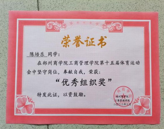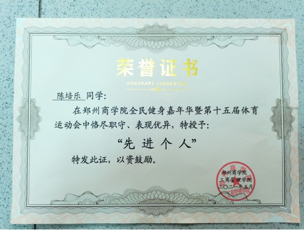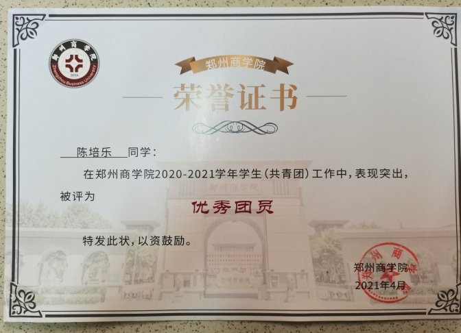 陈培乐在学习中,恪守学生职责,奋发向上,努力学习的同时不忘加强自身素质提升,疫情居家期间,该生也积极进行身体锻炼,强健体魄。在体育课学习中认真锻炼,听从老师指导。她认为积极投身于体育运动,增强身体素质,更是提高个人抗压能力的重要途径。在团支部也表现良好,荣获2020-2021学年“优秀团员”。