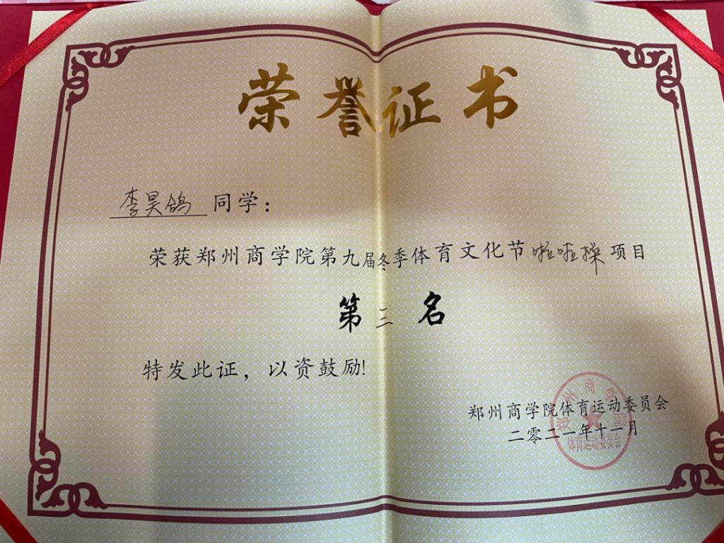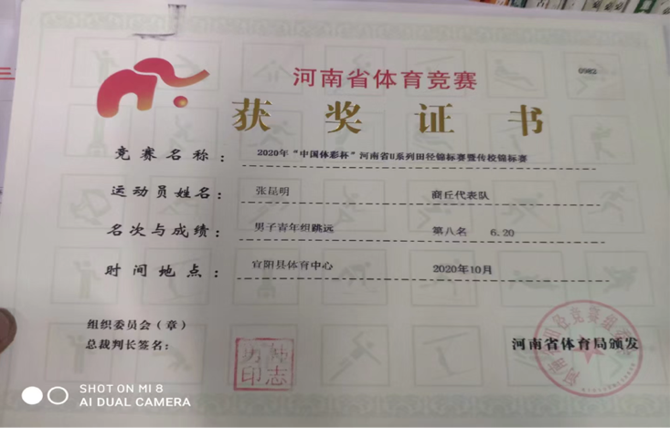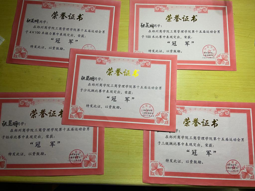 曾在2020年“中国体彩杯”河南省u系列田径赛暨传校锦标赛男子跳远第八名。在工商管理学院第十五届运动会男子跳远比赛中获得第一名。在工商管理学院第十五届运动会男子铅球比赛、男子100米比赛男子三级跳比赛获得第一名。在工商管理学院第十五届体育运动会4x100米获得第一名。