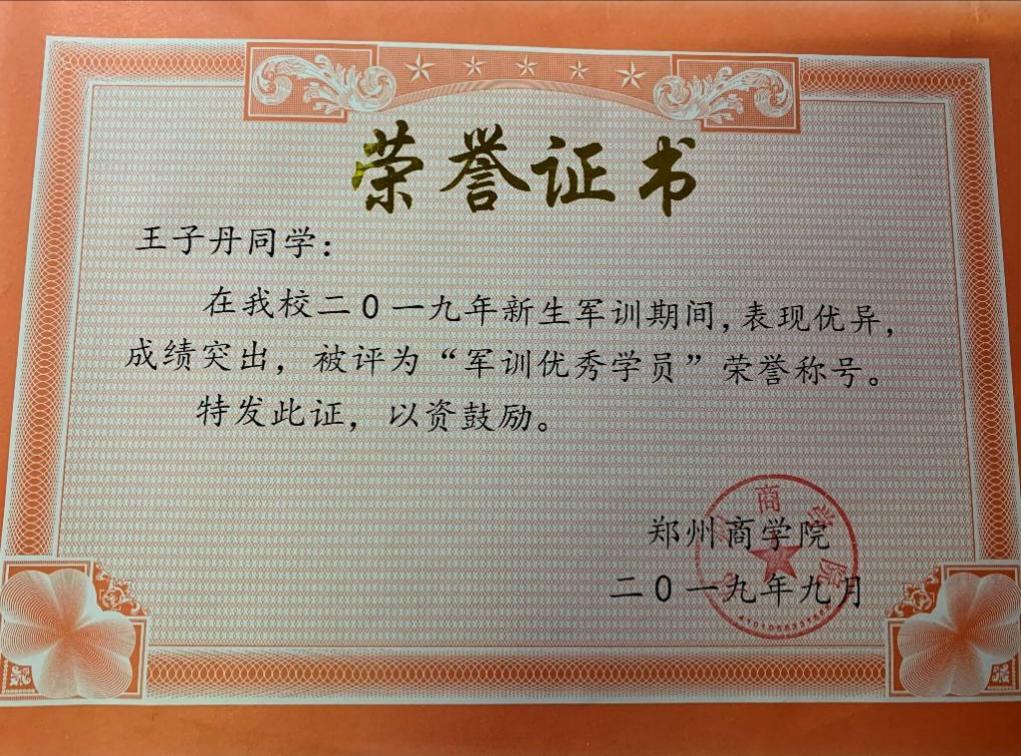 王子丹同学入校以来一直严格要求自己,在军训期间担任军训负责人,刻苦训练提升自我,获得“军训优秀学员”荣誉证书。在自我提升的同时带领全班同学一起训练,一遍一遍的练习走正步、帮助同学纠正错误动作、组织趣味活动等,提高了班级凝聚力。在训练中学会了坚持,不放弃,勇于战胜自己,磨练了不屈不挠的意志。