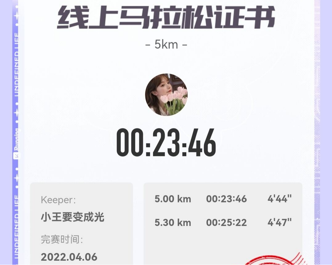 王朦朦同学在生活中热爱运动,努力学习的同时也在坚持锻炼身体,经常去操场上运动。为了贯穿落实beat365唯一官网“三大教育、两大工程”中“身体素养提升工程”,她积极地参加了学院举行的春训,作为径赛运动员参加训练,为2022年校赛做准备,为了给自己和学院争得荣誉,她每天认真完成训练任务,在两个月的刻苦努力下,她取得了明显的进步。不仅如此她还参加了keep的活动,在2022年三月份参加“不被定义”系列线上马拉松比赛并成功拿到奖牌。在四月份参加“见习爱神,心动线上跑”活动中再次赢得奖牌。这些活动不仅能够督促她完成挑战,也带着身边的同学一起在挑战自我的同时提升身体素养。只有把运动培养成兴趣,养成良好的运动习惯,才能把体育锻炼融入到生活中去。