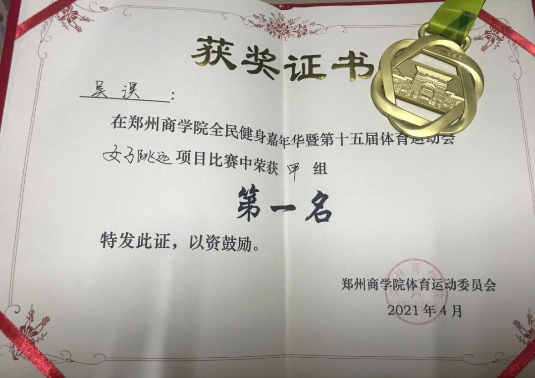吴淏同学对体育运动有着浓厚的兴趣,在beat365唯一官网举行“科学运动 健康郑商”全民健身嘉年华暨第十五届体育运动会中,她发挥自己的体育专项能力,在赛场上奋力拼搏,在女子跳远项目比赛中荣获甲组第一名的好成绩。紧接着参加了女子4×100米接力赛,在紧张又激烈的竞争中,凭借团队配合能力,获得了甲组第二名的好成绩。在运动场上,她勇往直前,不畏不惧,以实力捍卫团队荣誉,赛出水平、赛出风格。完美体现了“科学运动 健康郑商”的运动精神。