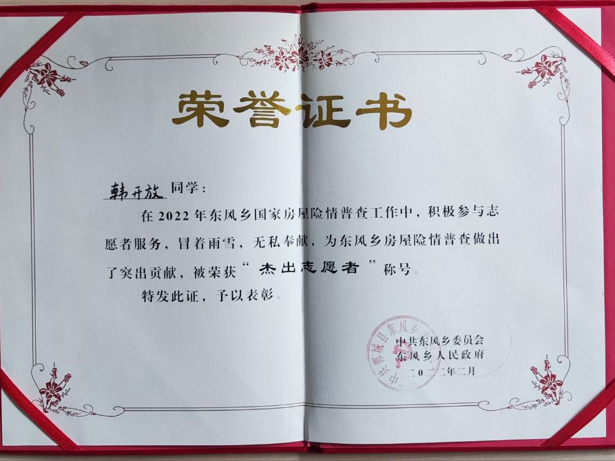 韩开放同学具有家国情怀,在寒假假期的时候,他没有被身边的手机和游戏沉迷自己。他展现了自己大学生的青春活力,疫情无情,人间有情。疫情防控,与爱同行。作为一名大学生,在听到家乡招募志愿者后,他毫不犹豫地报名参加了防疫志愿者工作,为村里的疫情防控工作出一份力。在这期间,他主要负责在进村的交通防疫卡点驻守,每天对进入村子的车辆人员查看健康码、行程码,登记信息及测量体温等。在郑州市疫情爆发以来,他协助村委干部加大力度对近期有郑州旅居史的人员进行排查防控,坚决筑牢人民健康安全的第一道防线。这次的志愿服务活动让他深刻地体会到“奉献、友爱、互助、进步”的志愿精神和村委干部工作的艰辛,同时也提升了他的综合能力和耐心。在今后的工作和学习中,使他将继续弘扬志愿精神,为社会做出应尽的义务和贡献。