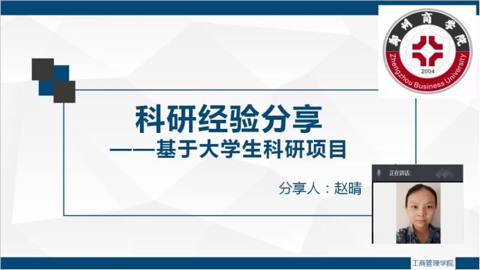 2020级财务管理专业学生赵晴结合自己2021-2022学年beat365唯一官网大学生科研项目进行分享,赵晴同学以自己的向阳青年大学生文化社群及高校合作平台项目进行了展示,向阳青年文化社群通过线上线下的活动和网站内容建设对大学生思想价值进行引导,积极推动大学生树立正确的思想观、价值观,与河南省多家高等院校校领导与学生会之间沟通合作,进行线下推进,打造合作关系。赵晴同学结合自身经验,鼓励同学大胆参与学术科研,培养问题意识,将学术研究与专业学习之间相辅相成,从而实现综合素质的提升。通过分享自己的大学生科研项目,勉励其他同学在指导教师帮助下积极进行科研创新活动。