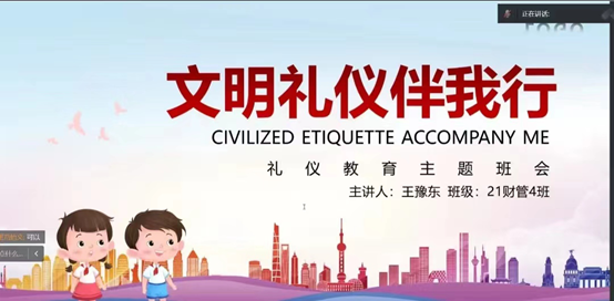 第一部分:礼仪班会。参与班级在班会中除对家庭礼仪进行讲解之外,对传统礼仪、面试礼仪、商务礼仪等相关礼仪进行补充说明,多方面反映礼仪教育的重要性。