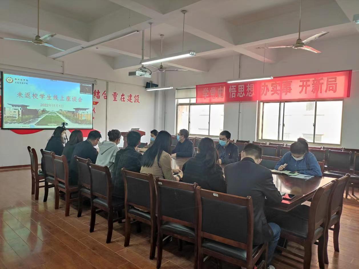 为做好因疫情暂缓返校学生的精准帮扶工作,及时解决学生在居家学习期间遇到的各种问题,缓解学生们的焦虑和压力,11月1日中午,我院在2号楼二楼会议室召开未返校学生线上座谈会,我院院长杨松柏、党委书记宋森、副院长张卫丽、团委书记魏瑶及辅导员参加座谈会。座谈会以线上+线下相结合的形式进行。