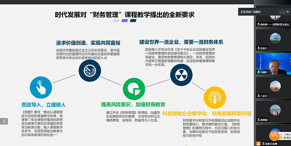 为推动新时代经管类专业学科建设,提高教师教学能力和学术研究水平,11月1日下午,财务管理教研室无课教师参加了“名师谈教学与科研”直播课堂系列活动:财务管理与管理会计。本次活动共分为6场,涉及财务管理与管理会计、行动学习、职业生涯规划与就业创业、审计、计量经济学等主题。