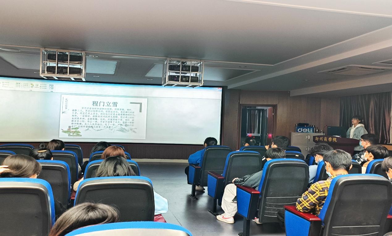 首先分享的是礼仪部高瑞英同学。高瑞英同学首先通过“程门立雪”“孔融让梨”两个历史小故事让同学们深入了解中国传统礼仪文化的内涵,然后分别从礼仪的内涵、起源、分类和现代礼仪文化这四个方面进行了讲解。朱聪慧同学则从商务礼仪方面向大家介绍有关商务礼仪知识,首先介绍了商务礼仪的基本原则——微笑和相互尊重,然后分别介绍了礼仪的TOP三原则,一些常识和注意事项,最后以一个商务礼仪小故事完成讲解。