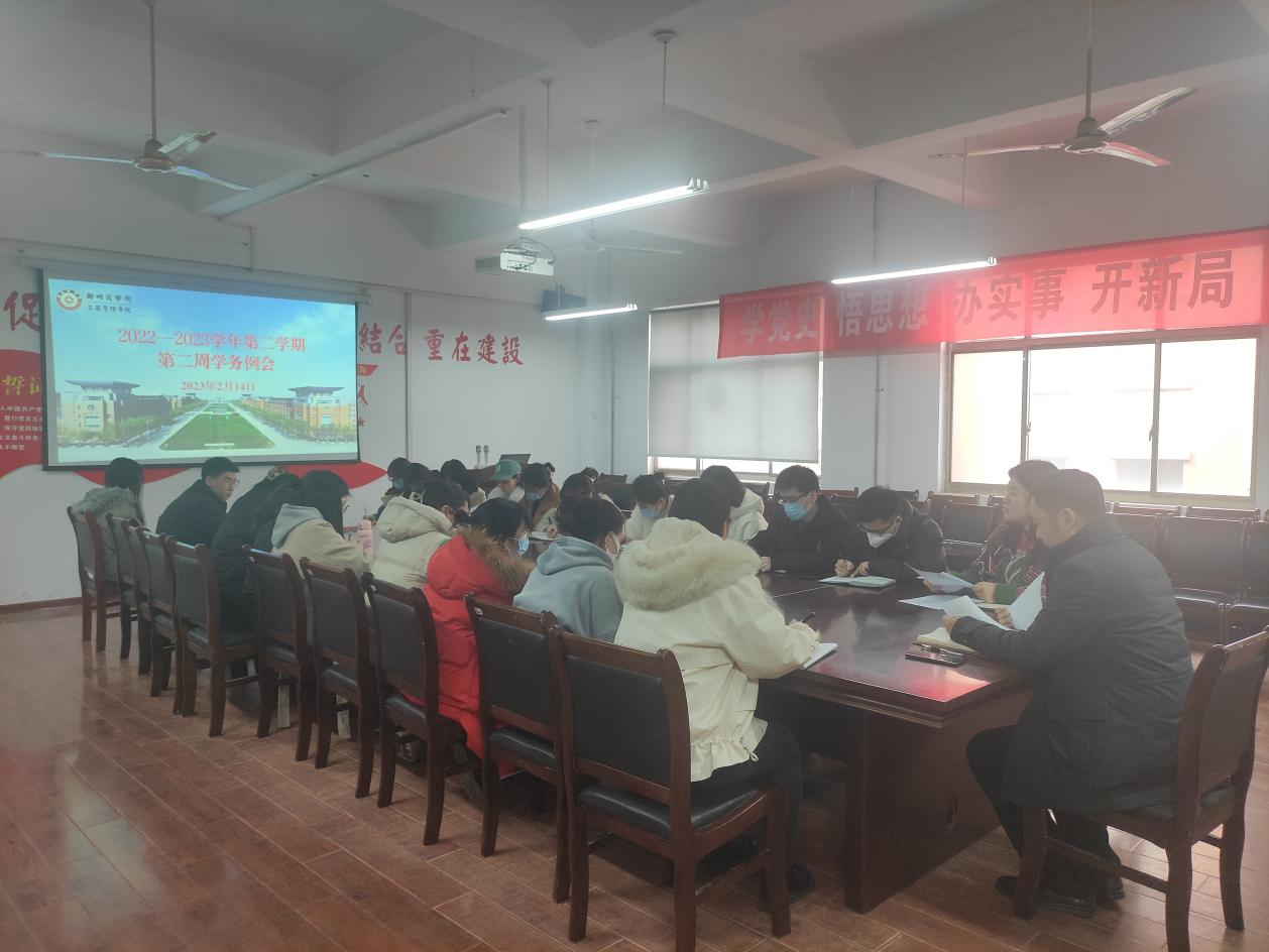 为贯彻落实学校最新工作部署要求,传达学务例会精神及本周工作安排,部署本周重点工作,2月14日下午,我院党委书记宋森、团委书记魏瑶及全体辅导员召开2022-2023学年第二学期第二周学务例会。