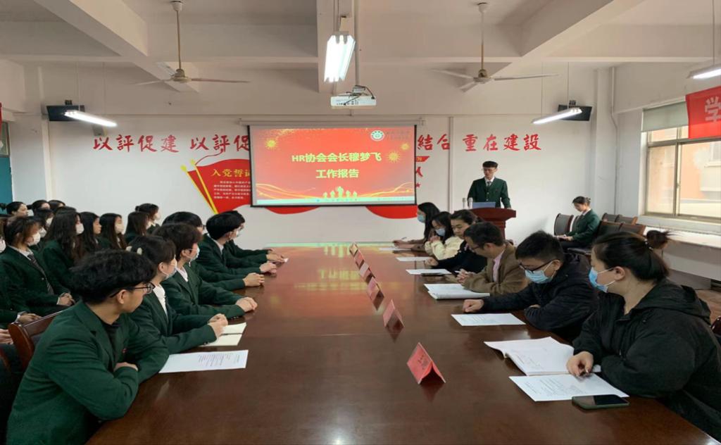 首先,由HR协会会长穆梦飞进行工作汇报。会长穆梦飞介绍了HR协会的性质和组织机构,并对上学期工作和本学期已开展工作进行了总结,对准备参加省赛的人员表达了期望,希望同学们能赛出实力赛出风格,取得优秀成绩。