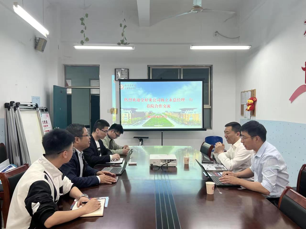 为进一步促进2023届毕业生就业工作质量提升,推进2024届毕业生实习实训工作开展,深化校企交流合作,坚持“走出去,引进来”工作理念,为毕业生开拓更多就业岗位,4月17日,我院特邀金好来公司杨总一行来校交流实习就业相关事宜,相互之间沟通用人需求,我院院长杨松柏、就业专员张逸凡、毕业班辅导员顾成健、魏亚旭参会。