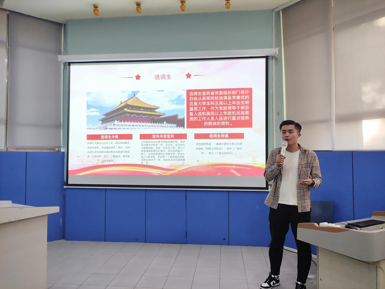 随后,陈佳龙同志结合自身学习、工作实际,从“选调生是什么、报考选调生的条件、选调生考试内容、面试经验、报考策略、工作中的体会和感悟”等方面给大家进行详细分享。他讲到,选调生备考要注重“软实力”的积累和“硬实力”的训练,一是“学”,学好专业知识,学习习近平总书记讲话,多读习近平总书记的文章;二是“做”,做到全面发展来丰富自身经历,要从学生干部以及社会实践等各个方面发展自己,注重培养自身的家国情怀。