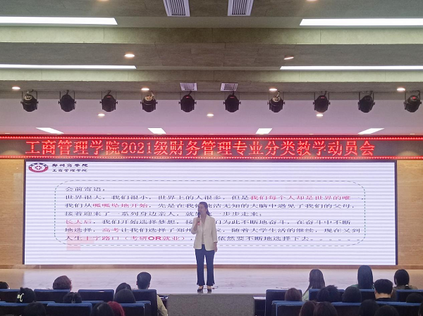 其次,在自力楼3楼报告厅内针对2021级财务管理专业全体学生开展了专业分类动员大会,会议由梁瑞静老师主持。我院副院长张卫丽、财务管理教研室主任李鸿春、特邀嘉宾广州丹成财税顾问有限公司总经理周艳以及2021级全体辅导员和学生参会。