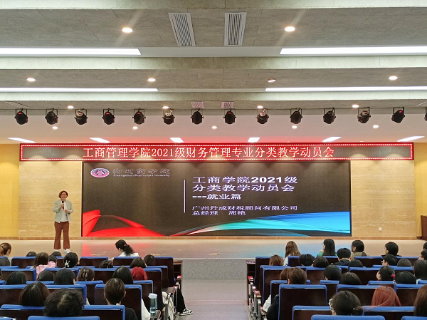 其次,在自力楼3楼报告厅内针对2021级财务管理专业全体学生开展了专业分类动员大会。我院副院长张卫丽、财务管理教研室主任李鸿春、特邀嘉宾广州丹成财税顾问有限公司总经理周艳以及2021级全体辅导员和学生参会。