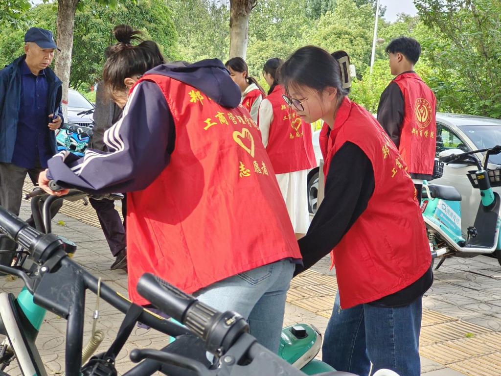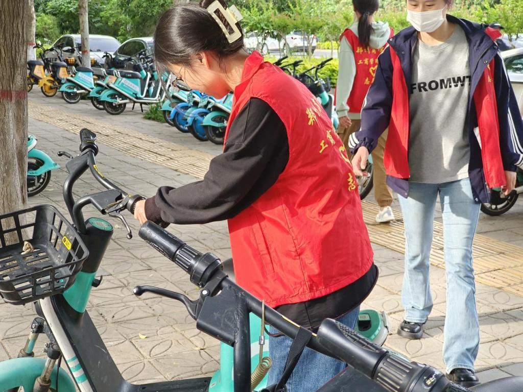 活动期间,志愿者们将学校周边无序停放的共享单车,按照“规范停放,摆放有序,朝向一致”的原则进行整理摆放,共享单车陆续回归原位,腾出相应的空间让行人自由通行,做到了不占用盲道、不影响行人出行、消除了可能存在的安全隐患。在车辆摆放整齐后,志愿者们还将共享单车停放地附近的垃圾清理干净。对于有损坏需要维修的车辆也进行集中摆放,方便后续修理人员处理。大家相互协作,热情洋溢,展现当代大学生的面貌。
