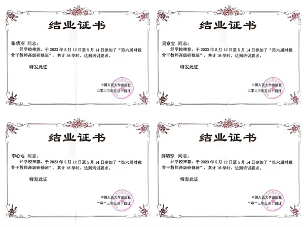 伴随着党的二十大报告中提出的“健全现代预算制度,优化税制结构,完善财政转移支付体系”等一系列重大改革,财税课程的教学内容也需要与时俱进,不断更新和调整。为配合我院税收学新专业的建设,提高财税类学科教学与研究的水平,5月12-15日期间,特选派骨干教师张倩丽、李心地、薛培琼、吴京宝赴北京参加由中国人民大学出版社举办的“第六届财税骨干教师高级研修班”。此次财税骨干教师高级研修班,旨在交流教学心得和研究成果。