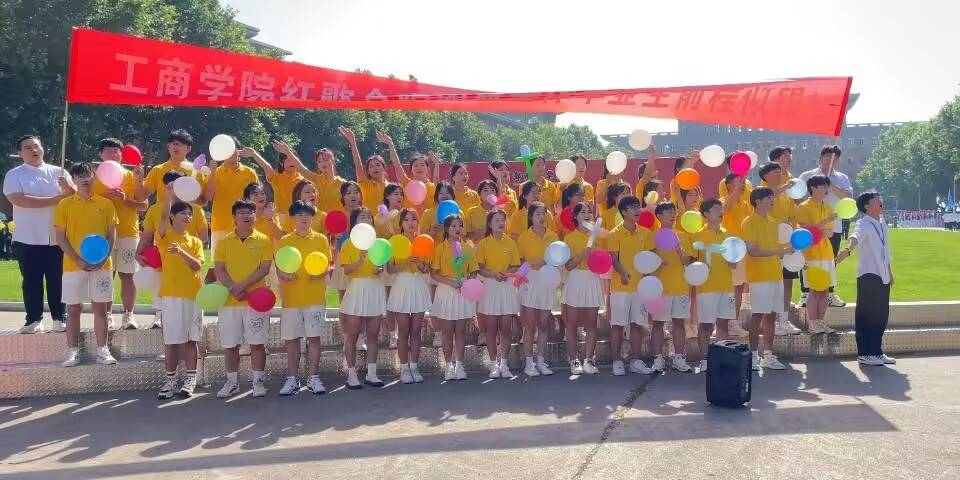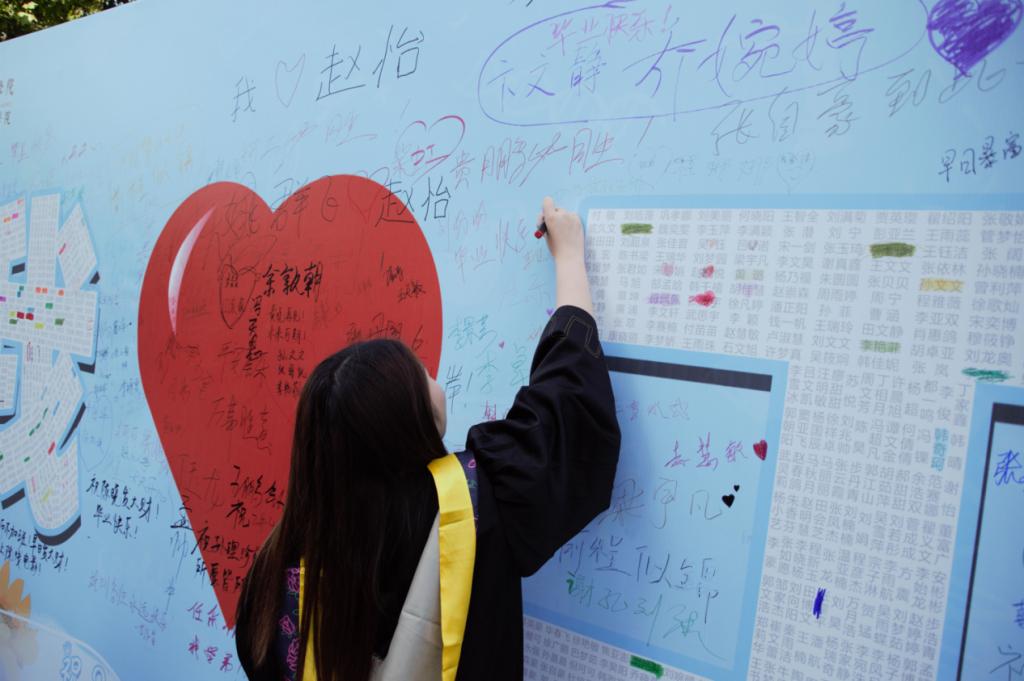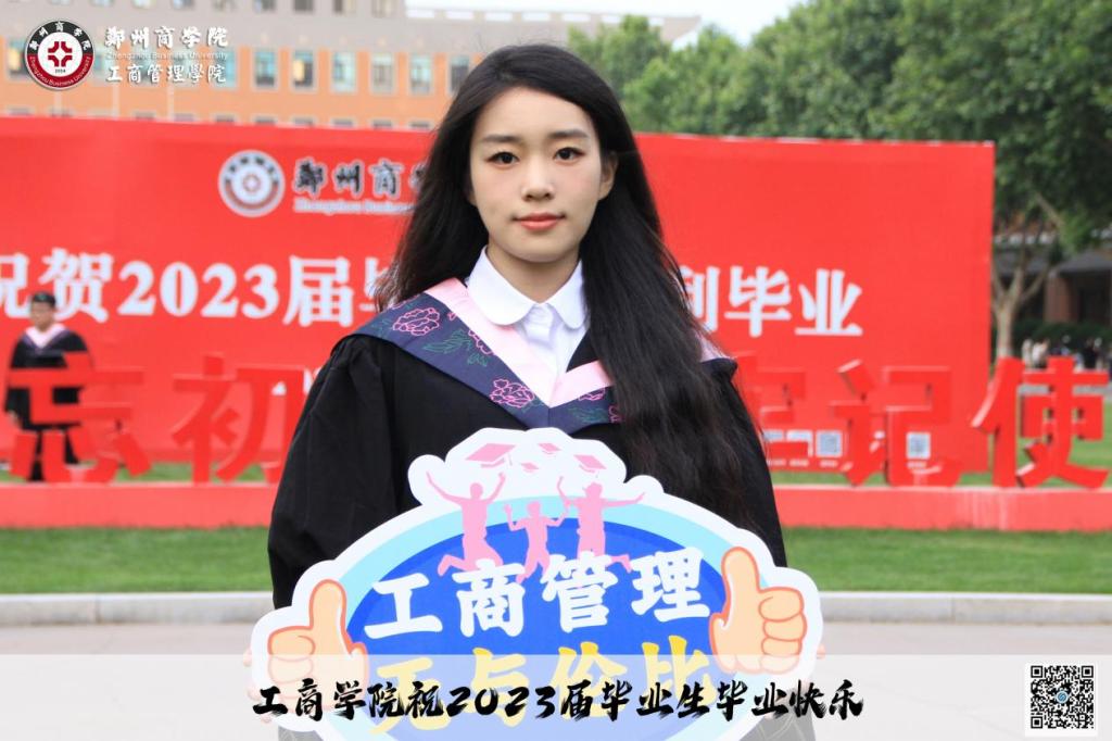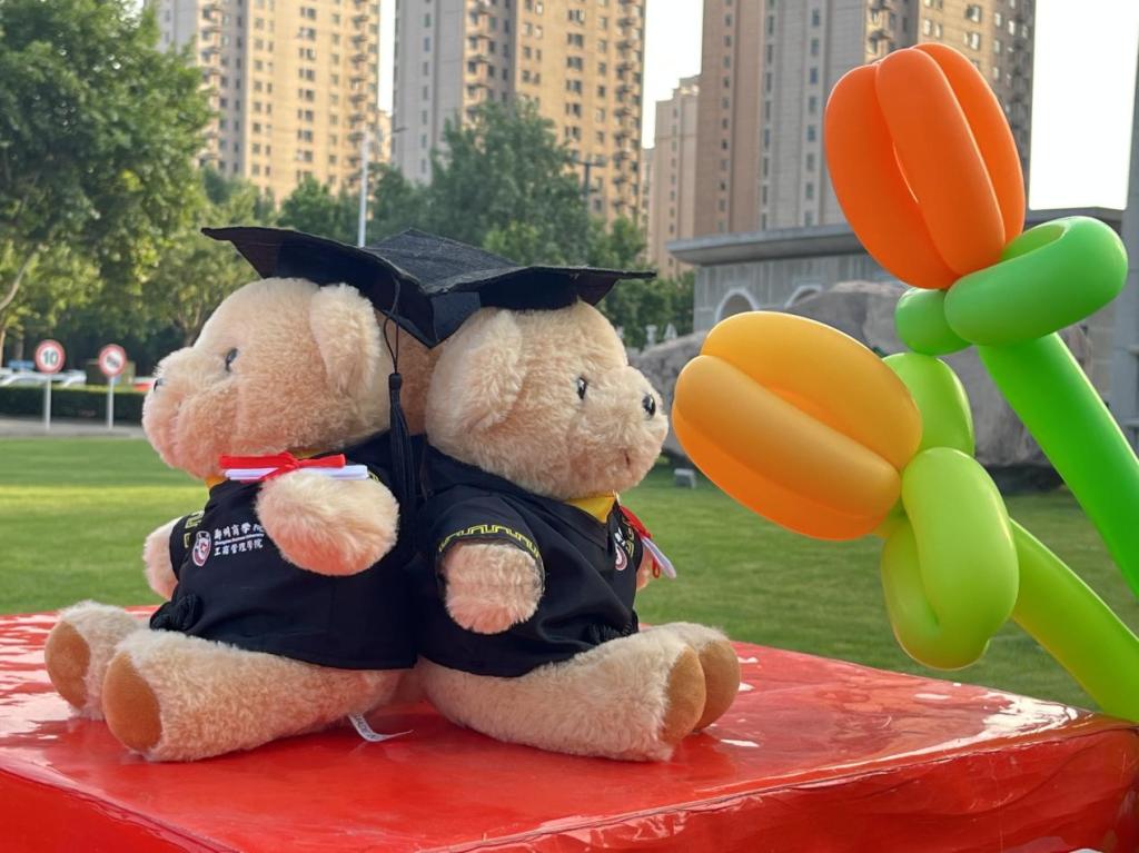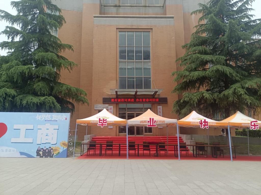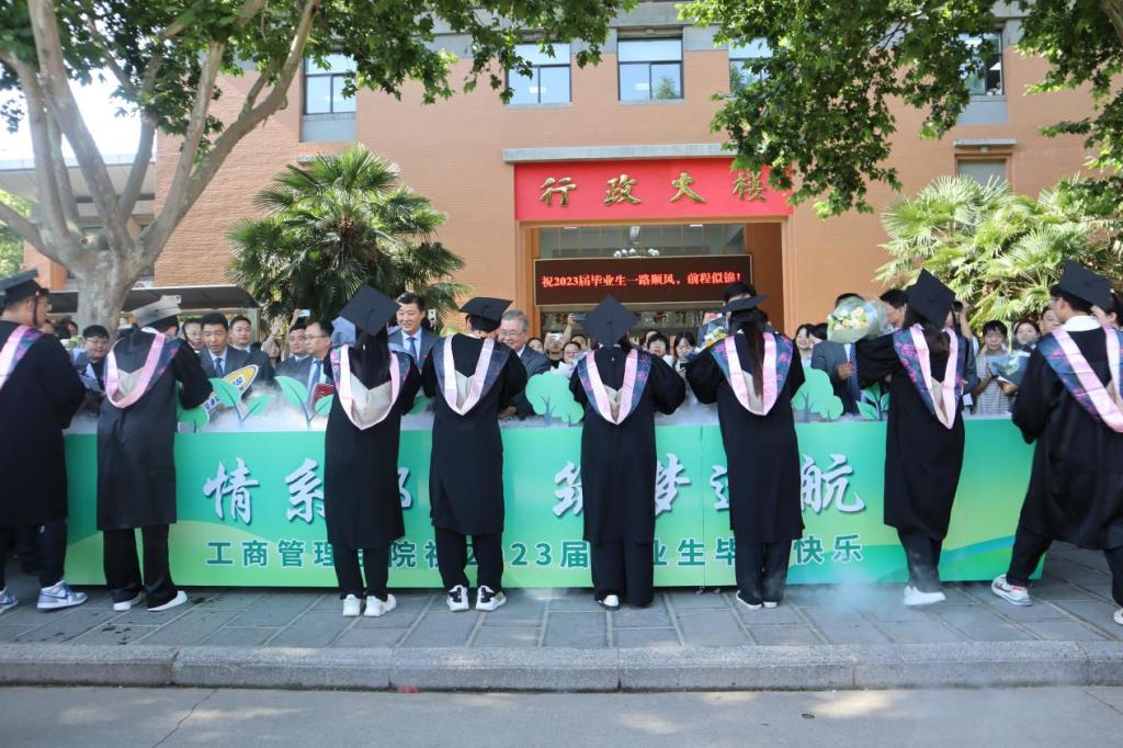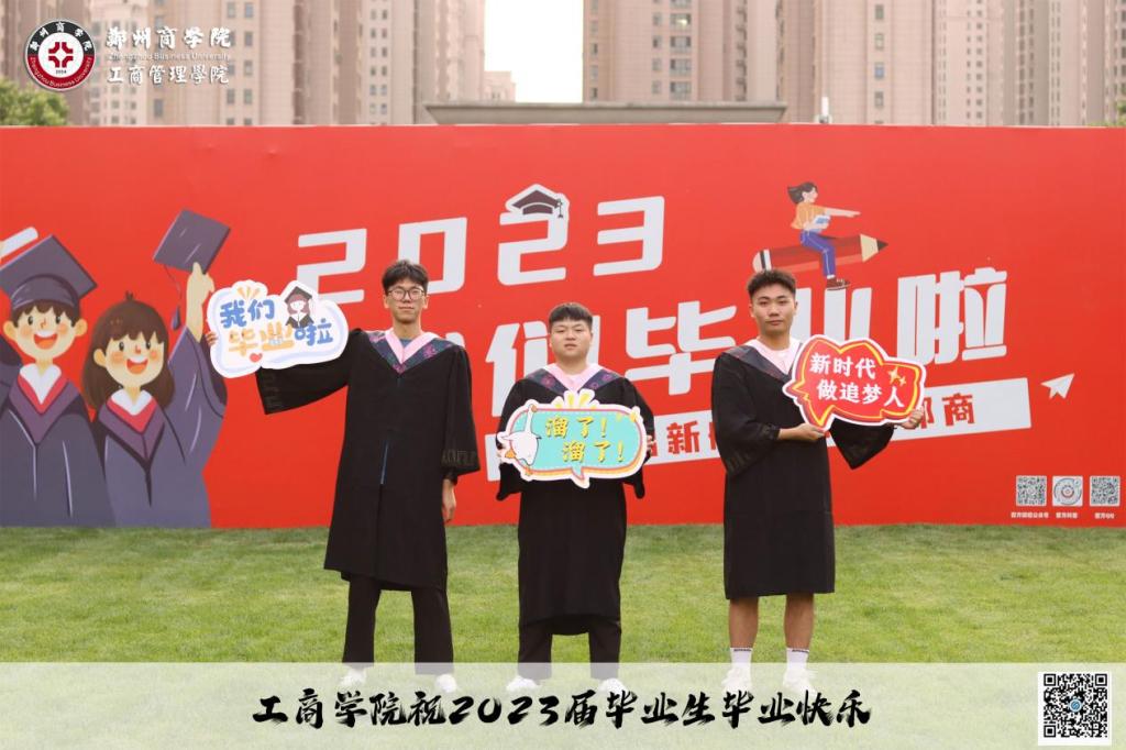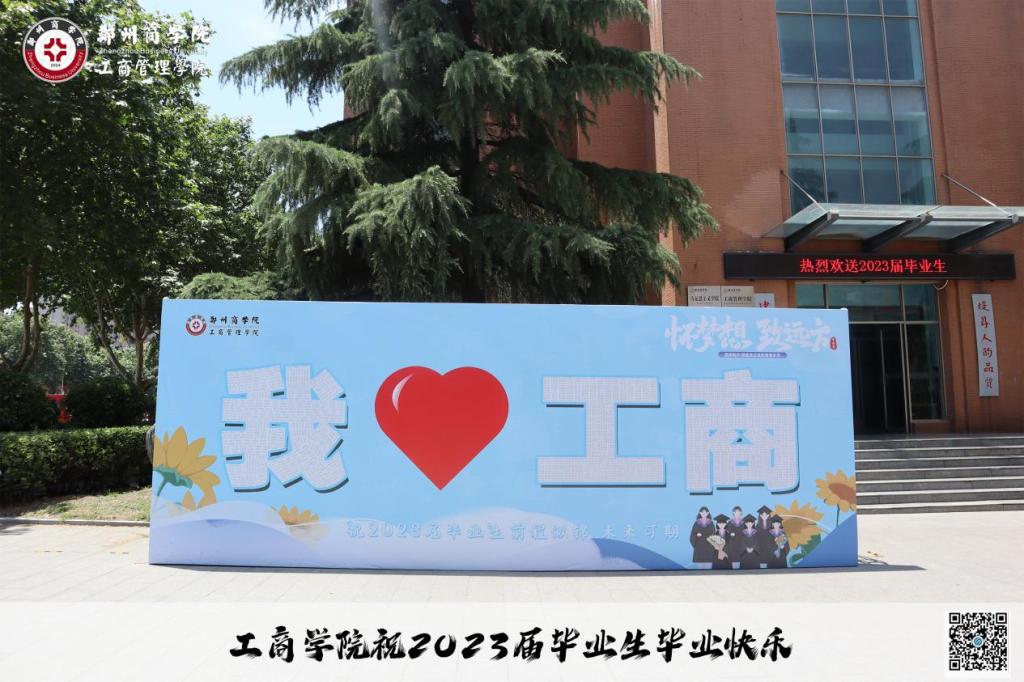 学院门口放置以工商学院全体毕业生姓名组成的“我爱工商”喷绘;电子屏播出“祝2023届毕业生毕业快乐”“愿有前程可奔赴,亦有青春可回首”;定制的“我爱郑商”“地球很大,郑商是家”“家人们谁懂啊,毕业啦”等KT版和“下次网购时,别忘了修改你的默认收获地址”“愿有前程可奔赴,亦有岁月共回首”等各种美好的祝愿条幅在观礼区域飘扬。