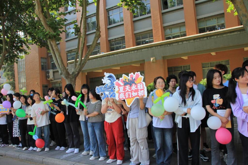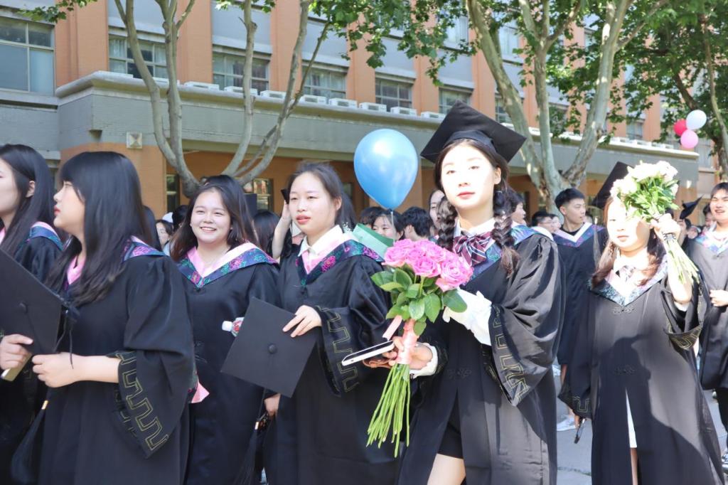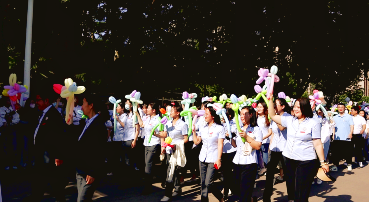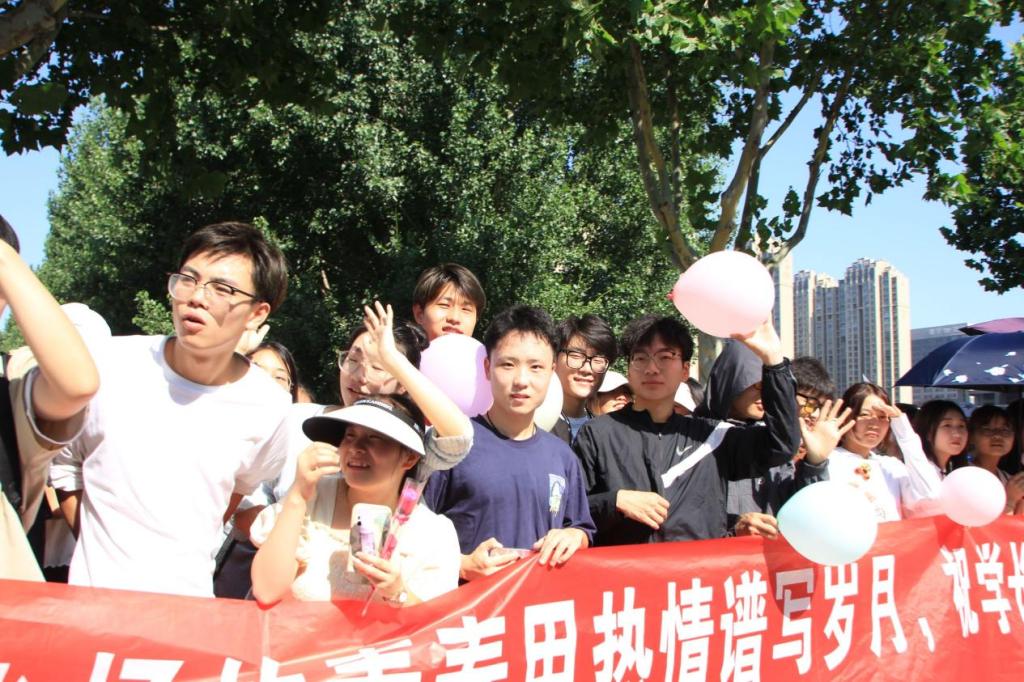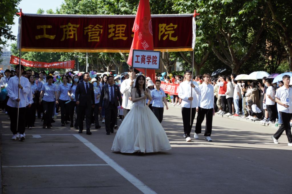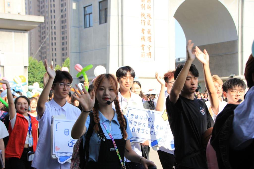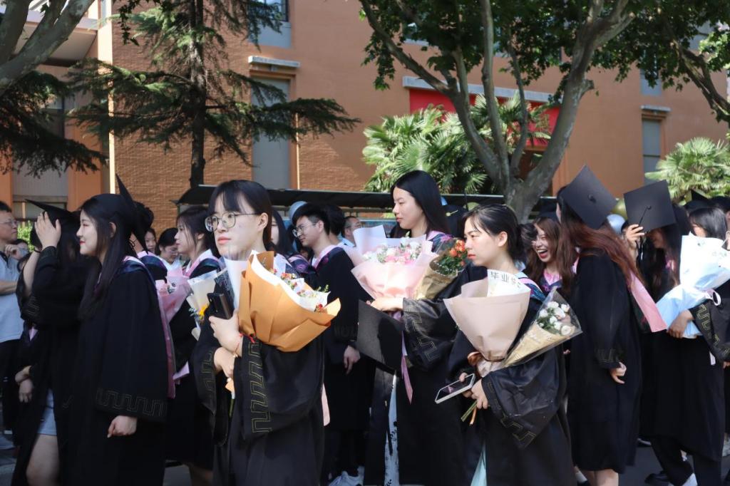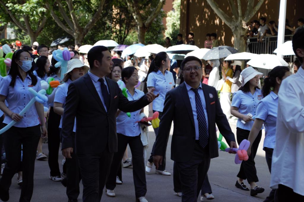 教师方阵、优秀毕业生代表方阵、考研学生成功上岸方阵、毕业生方阵从成功大道出发,依次前进。教师方阵的每位教师都手持气球花,这代表他们对学生的深切关爱和美好祝愿;考研同学手持KT板,在KT板上标明着他们成功上岸的学校名称,希望他们未来的道路将会一帆风顺,更加明亮。