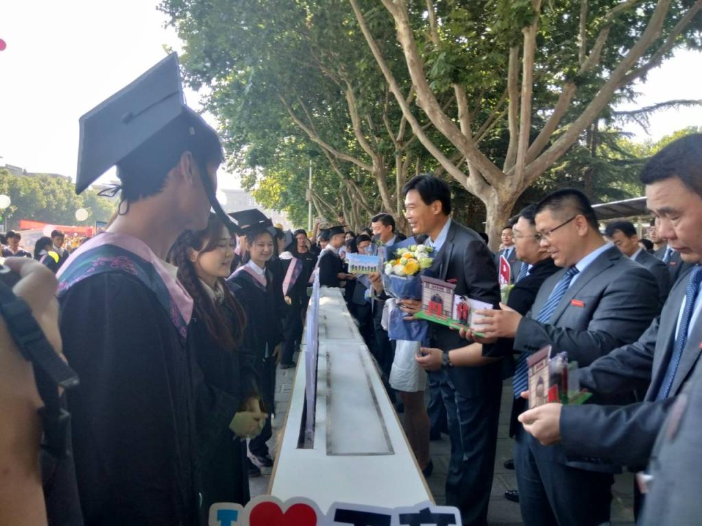 表演完毕,我院毕业生代表纷纷来到王育华董事长、陈坚德董事、吴建军书记、吴泽强校长一行面前,送上一束鲜花、一份礼物表达了工商学院全体毕业生对母校、老师诚挚的感谢和深深的感恩。愿母校桃李满天下,学子尽乾坤。