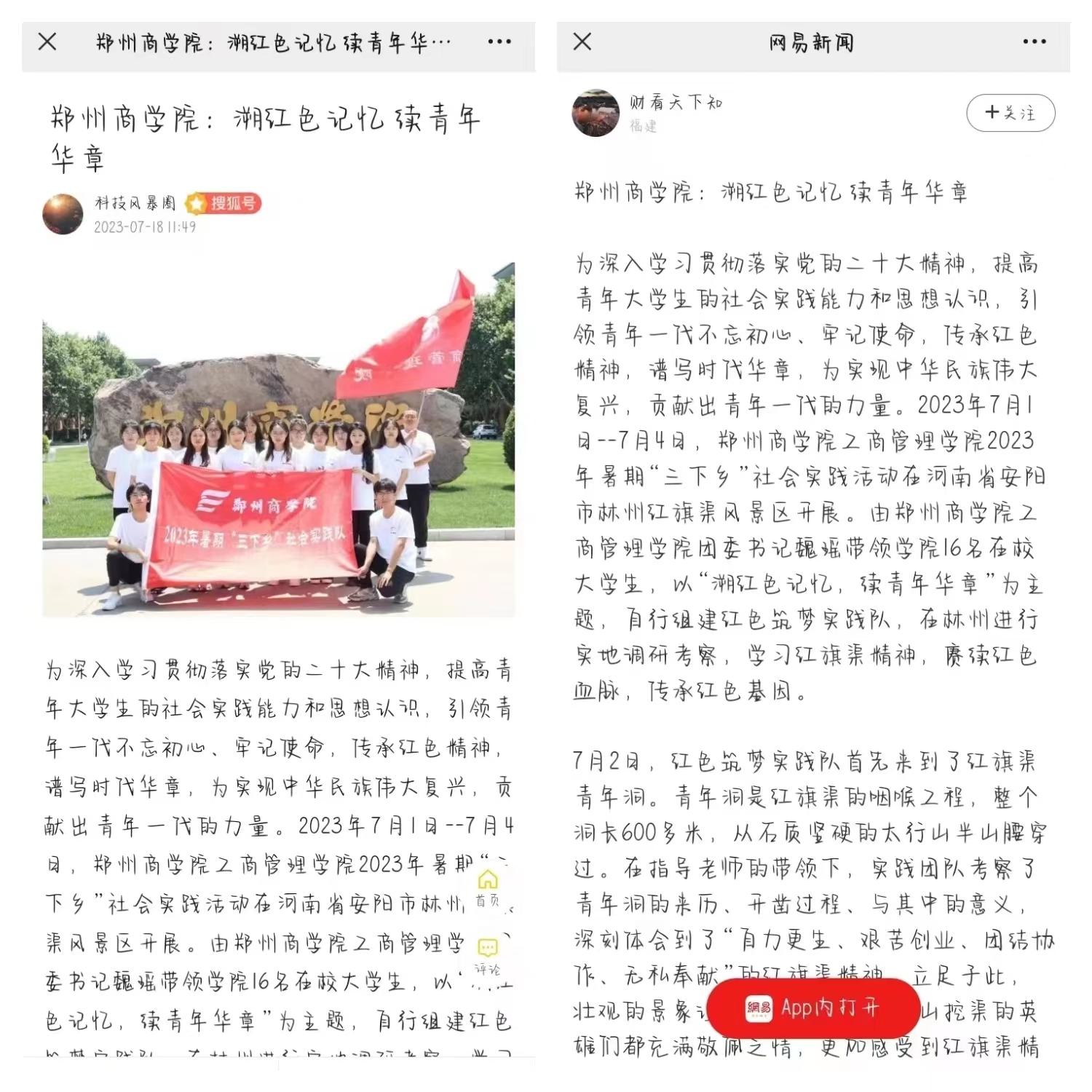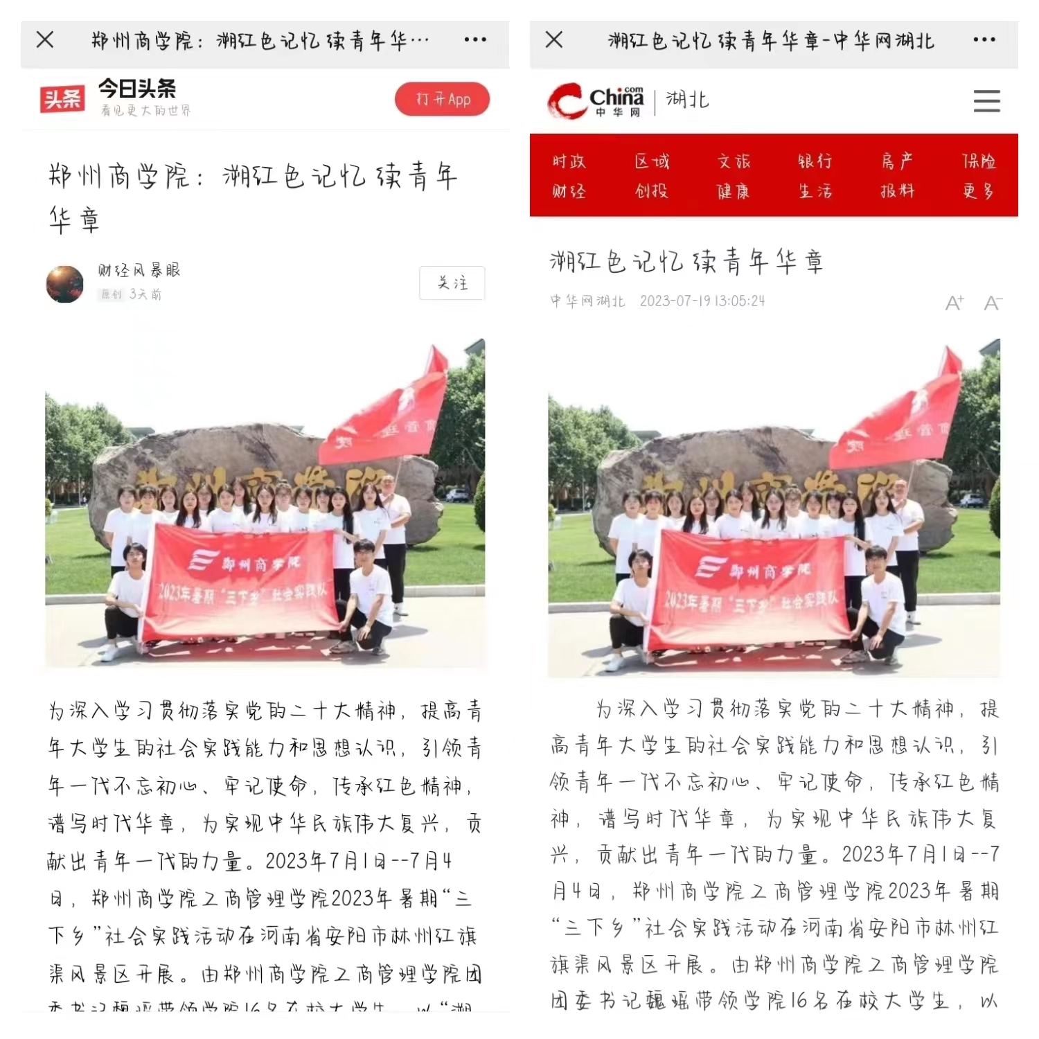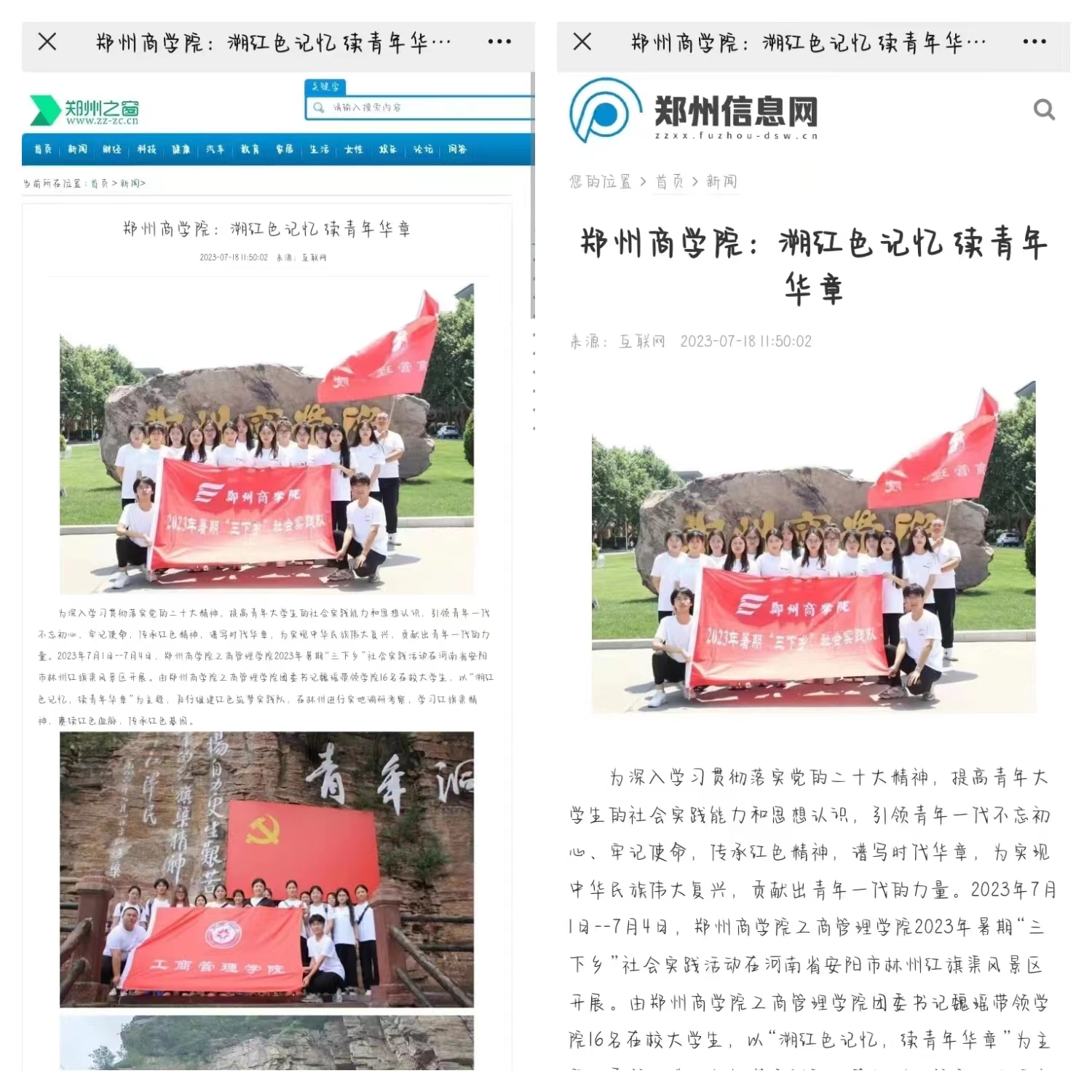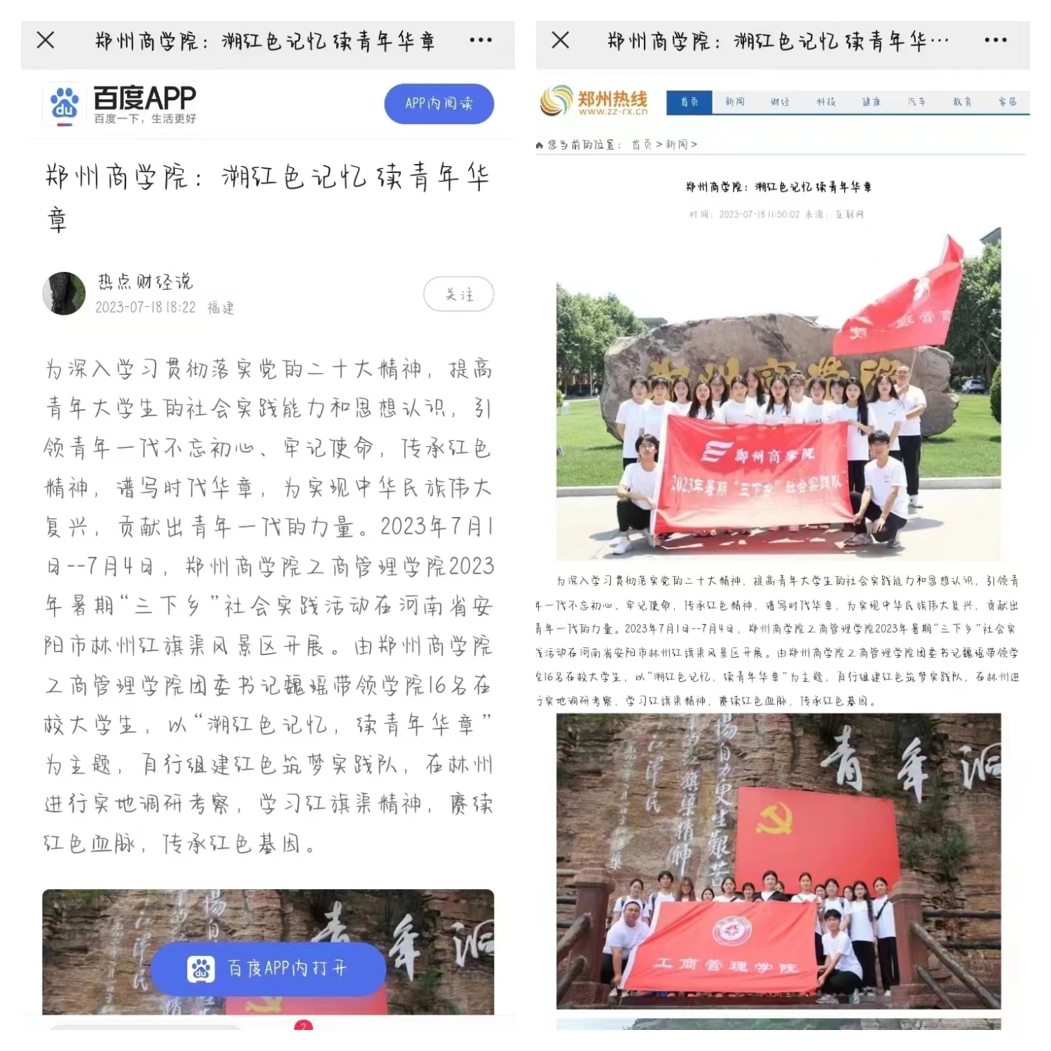 此次暑期“三下乡”社会实践活动得到社会大众的广泛认可,先后受到“今日头条”“搜狐网”“网易新闻”“郑州热线”“郑州之窗”“郑州信息网”“中华网”“百度”等多家主流媒体的关注和报道。下面让我们跟随红色筑梦实践队的脚步,回顾一下此次活动的内容吧!