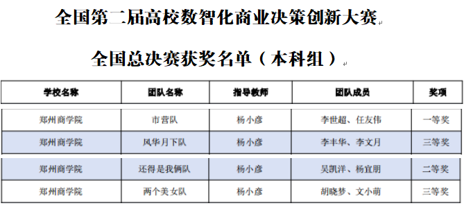 9月23日-24日,由中国商业经济学会主办、西安电子科技大学承办的全国第二届高校数智化商业决策创新大赛全国总决赛在西安成功举办,beat365代表队以河南省决赛第一名的优异成绩晋级全国总决赛,并在全国总决赛中取得全国十强、一等奖的优异成绩。